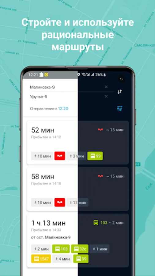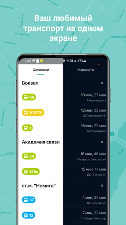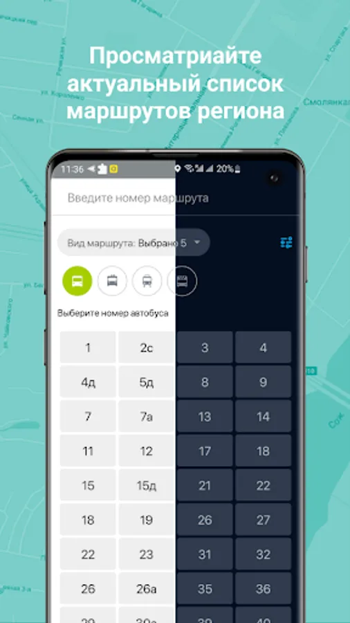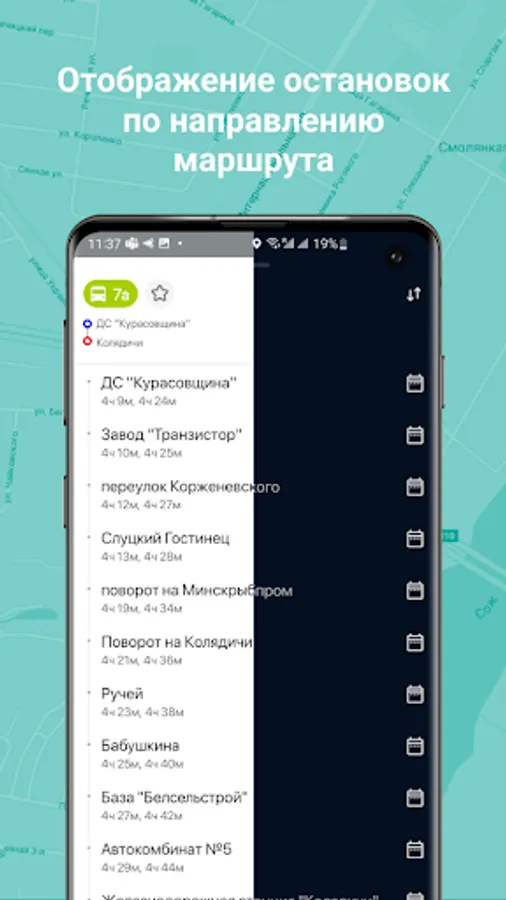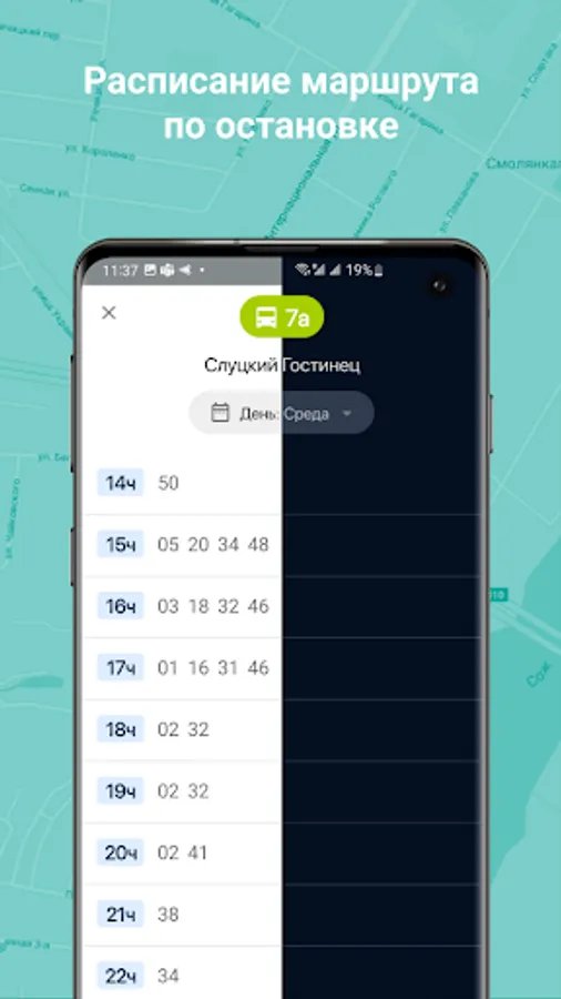 The application allows you to build routes and view the schedule not only in cities, but also in the district and region. Move the map to the desired point and you will immediately see the schedule for that region.