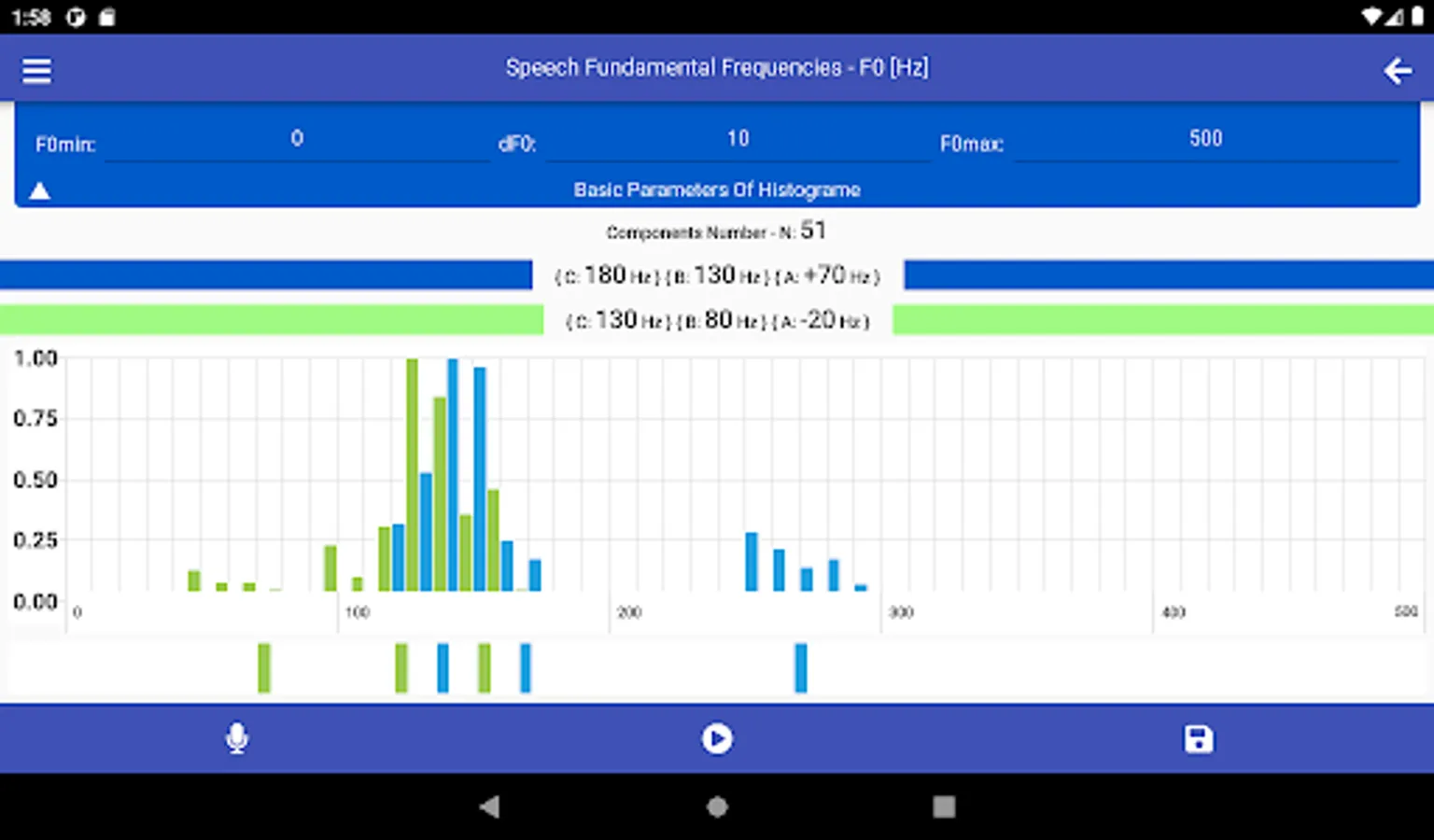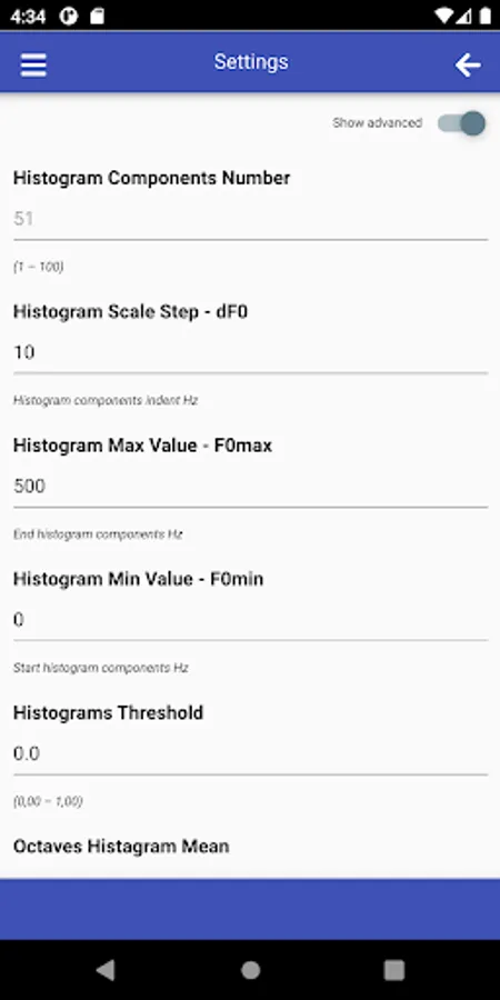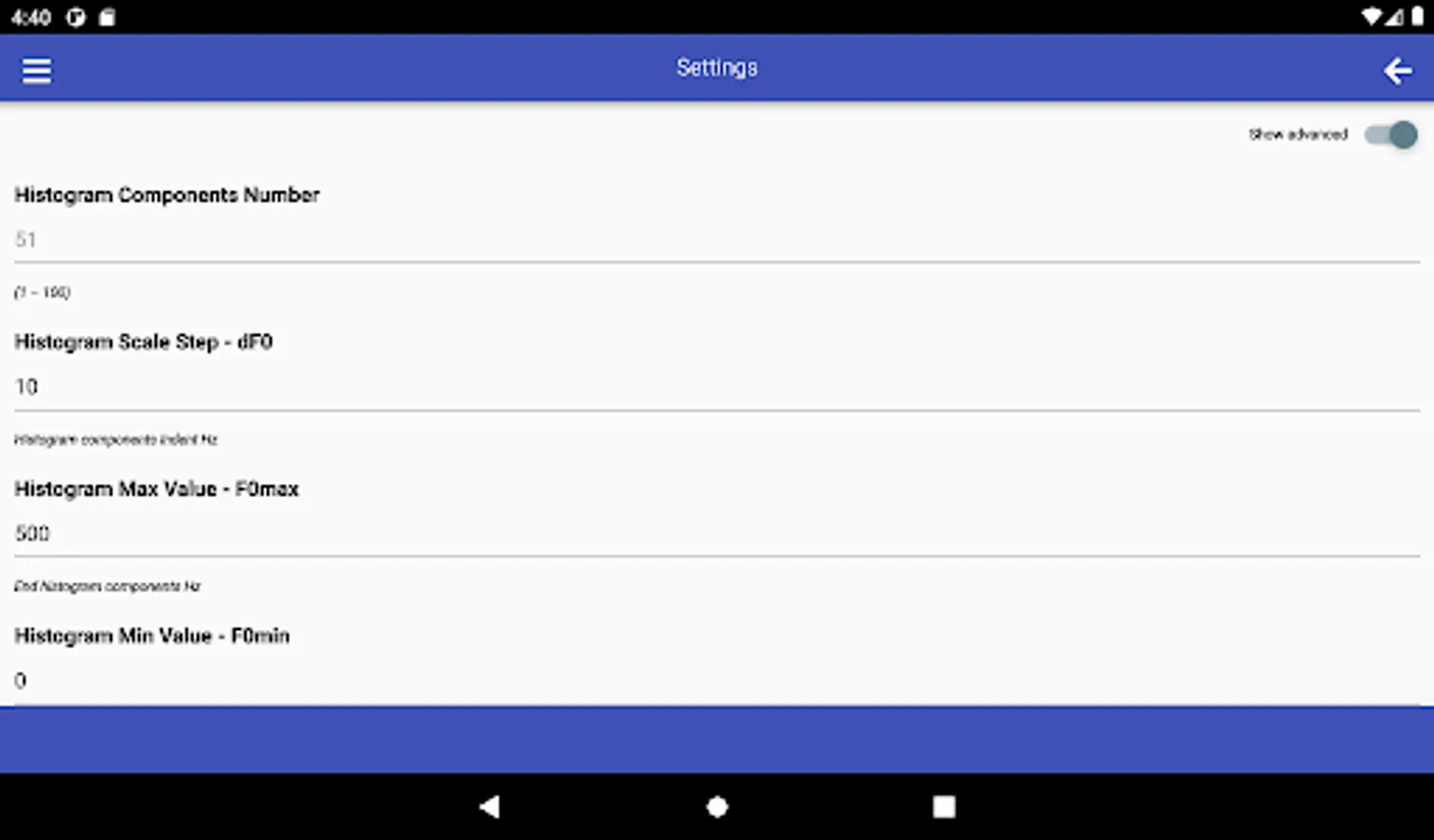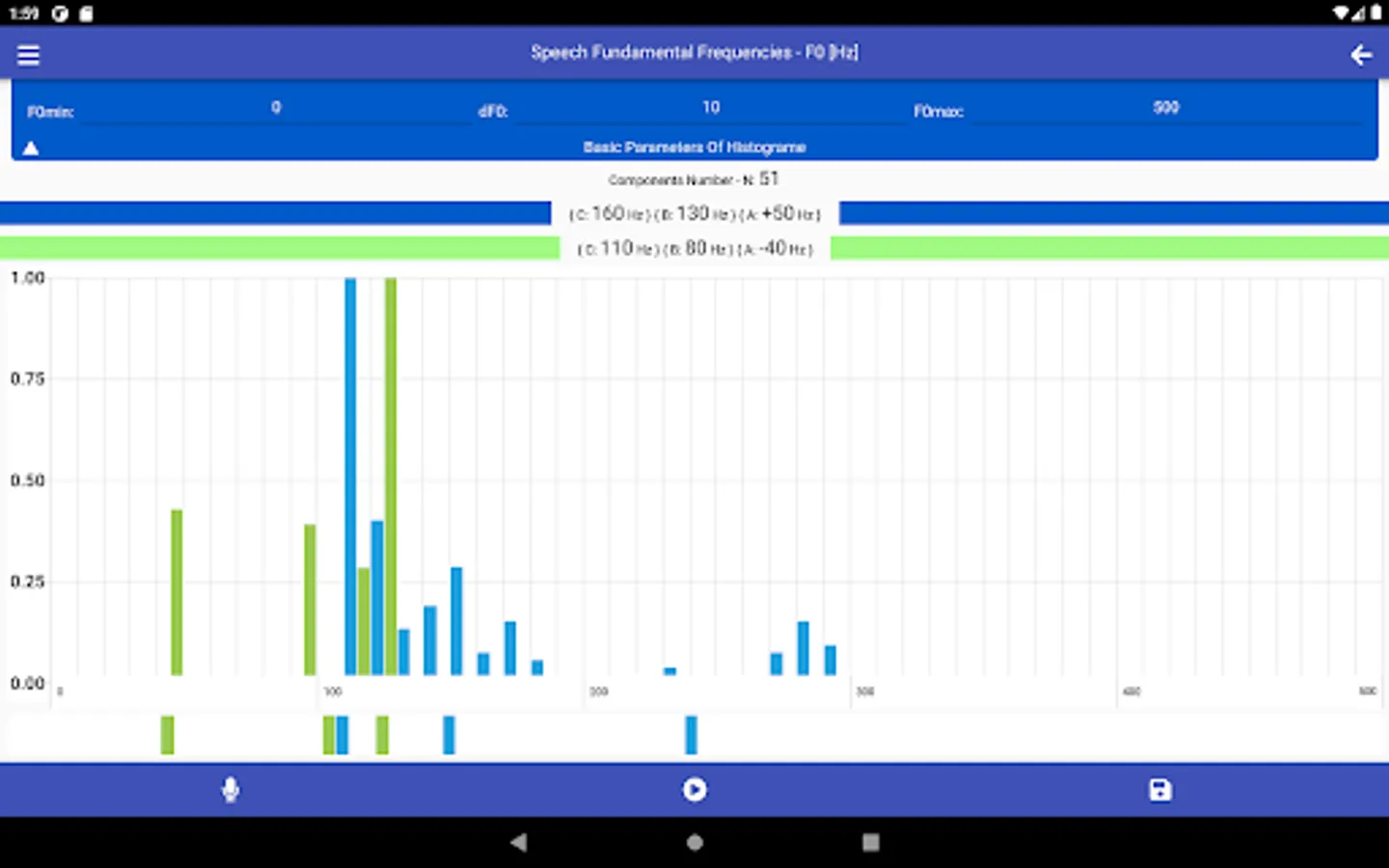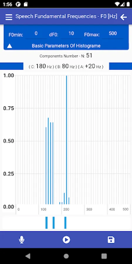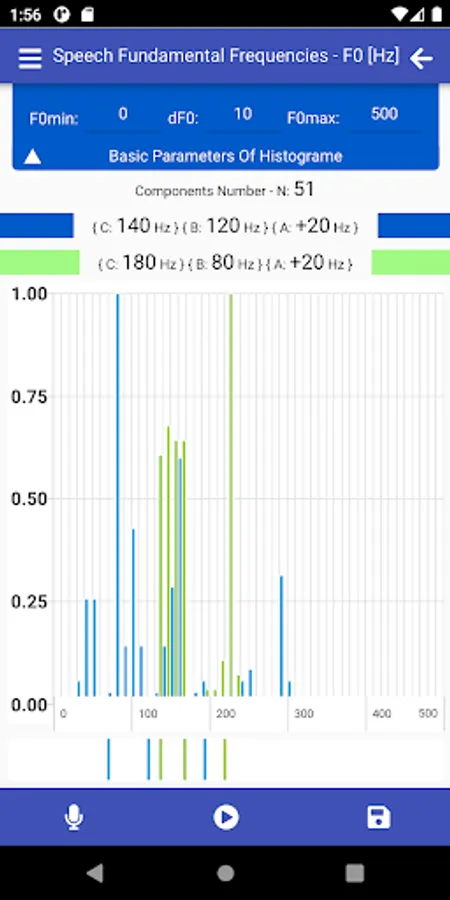 SMM has a wide range of options for choosing linear scales for constructing histograms used in the analysis of speech melody characteristics, namely: the range of analyzed frequencies - F0min and F0max, as well as frequency resolution - dF0. The choice of specific values of these parameters determines the number of histogram components - Nc.