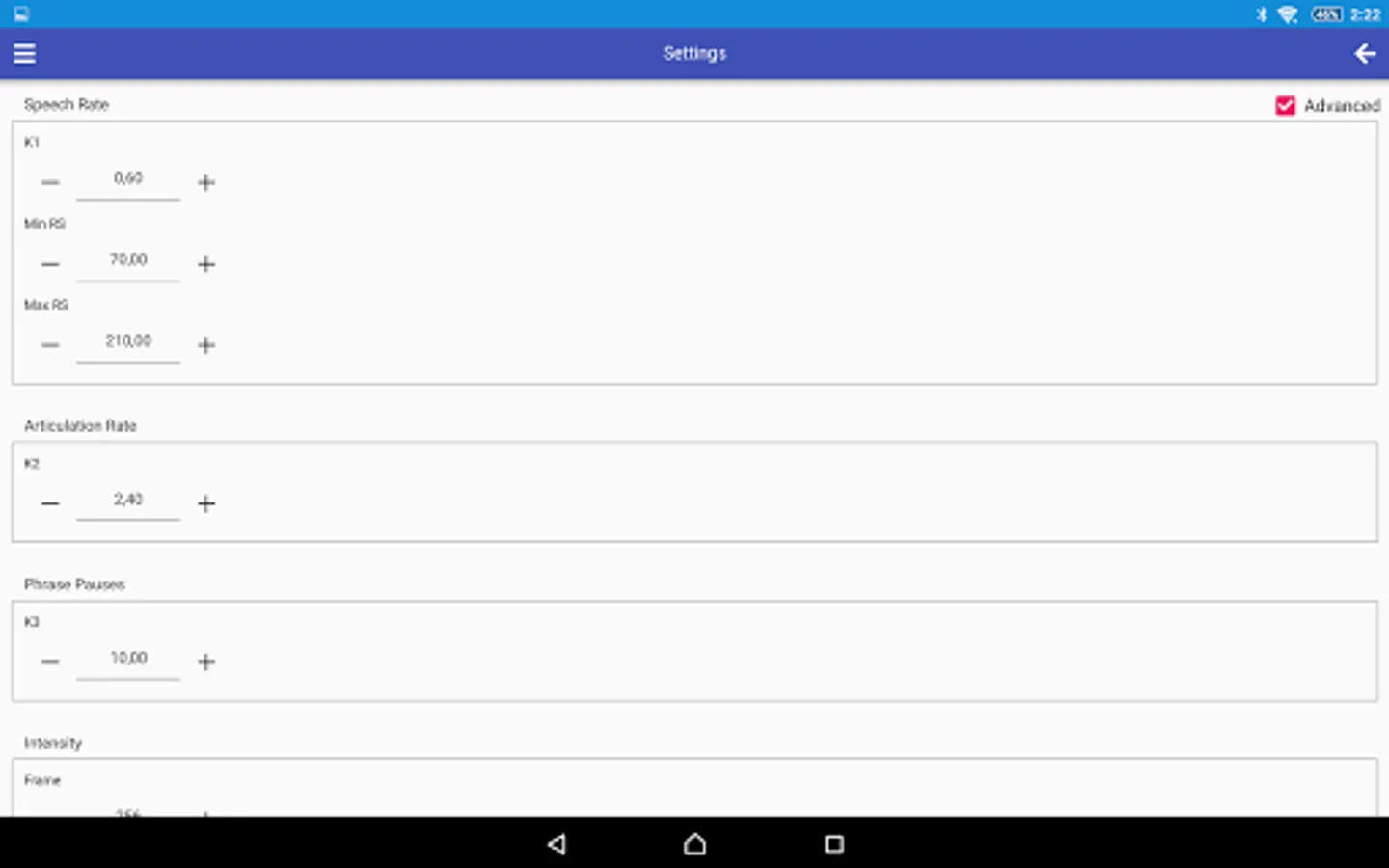 The SpeechRateMeter (SRM+) software is designed to measure the speech tempo as a complex prosodic component of intonation, the parameters of which are: