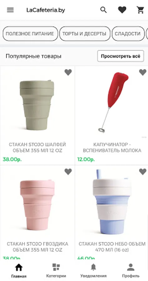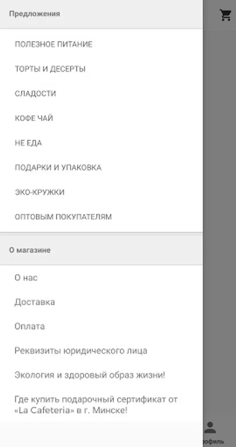 La Cafeteria.by - online store of the eponymous coffee house "La Cafeteria". In the online store, you will find many products from well-known brands, eco-products manufacturers, bakers, artisans. The assortment includes more than 100 types of freshly roasted coffees from major producers and craft roasters. There is tea, both in standard and gift wrapping. Healthy food is presented in a wide range. Choose cakes, desserts, sweets, lollipops, sweets and more in the sections of our application. You can also collect a gift from the assortment of the online store, which can be packed in a box. You can also order a ready-made gift with delivery to the addressee. We offer environmentally friendly products that do not harm nature, such as mugs made of bamboo fiber and natural silicone, thermoses and bottles made of BPA free plastic.