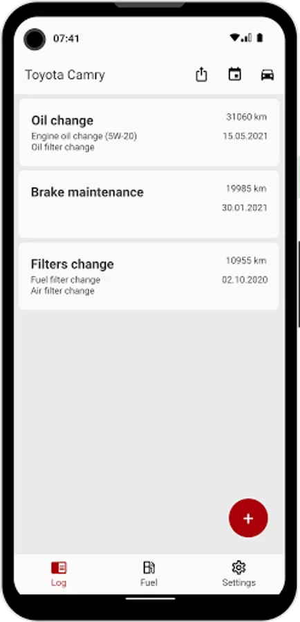 In Log section stored records about car maintanance. This records includes Title with short description, Mileage value, Date when works was made and Text with detailed description of performed work. This records can be exported by user to PDF file.
