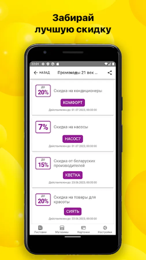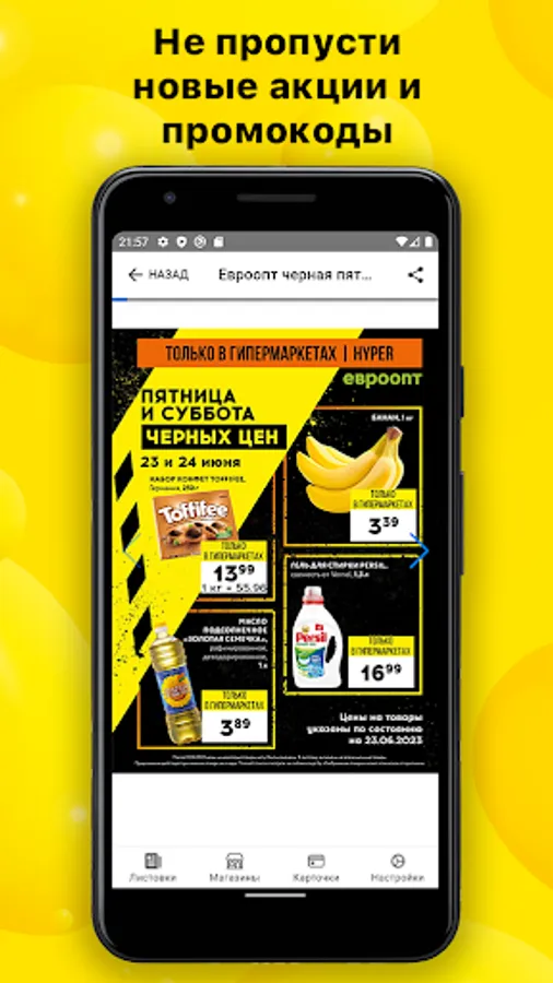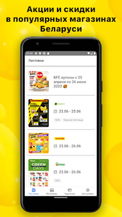 All promotions of popular stores in Belarus: Dobronom, Groshyk, Martin, Euroopt, Mayak, Crown, Almi and Spar, Green, Neighbors, Perekrestok, Hit and others.