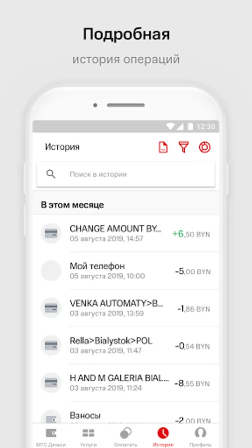 • view a single transaction history, analyze expenses, and generate a statement on your subscriber account, including expenses for communication services for any period of time;