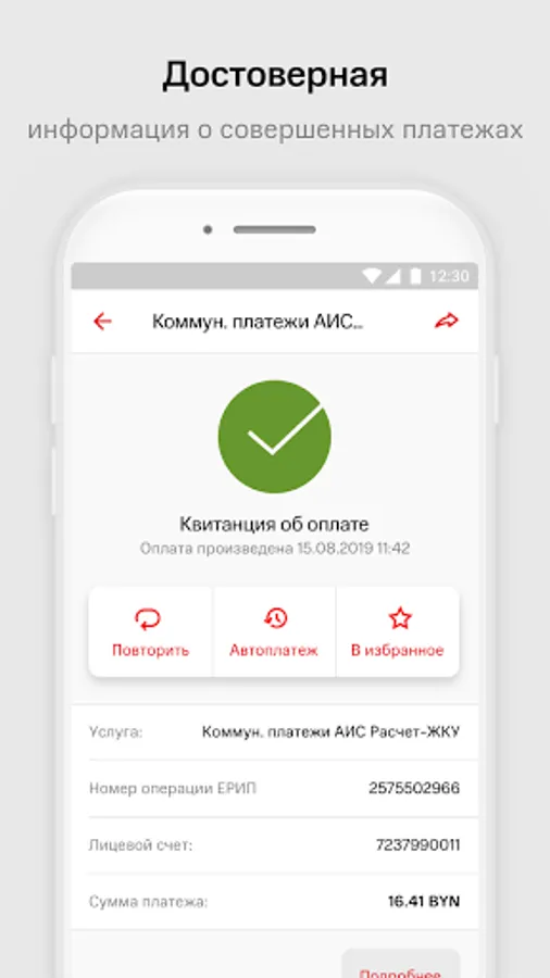 Set automatic payments with any period and time convenient for you to pay, add any payment to your Favorites, look at the transaction history, get a payment receipt and send it to your inbox.
