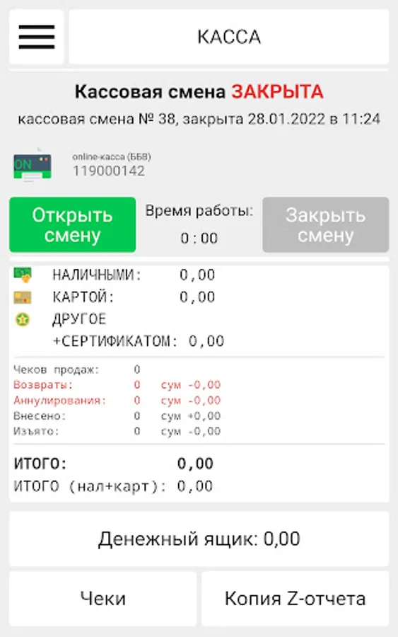 - a document of registration of the operation of depositing cash received before the start of work (shift);
