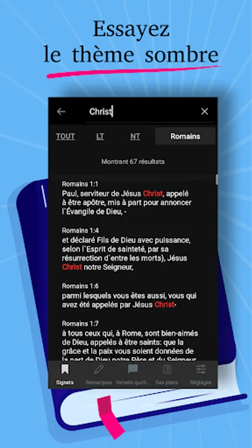 We offer a practical tool with which you can feel for free (free) all the usability of the Holy Bible without the Internet (offline). We've added the ability to study the Bible with a smart daily reading plan to the app. You can refer to the verse of the day. Easily create many bookmarks and color notes. Use a convenient search and configure a dark theme for a better perception of the Bible text.