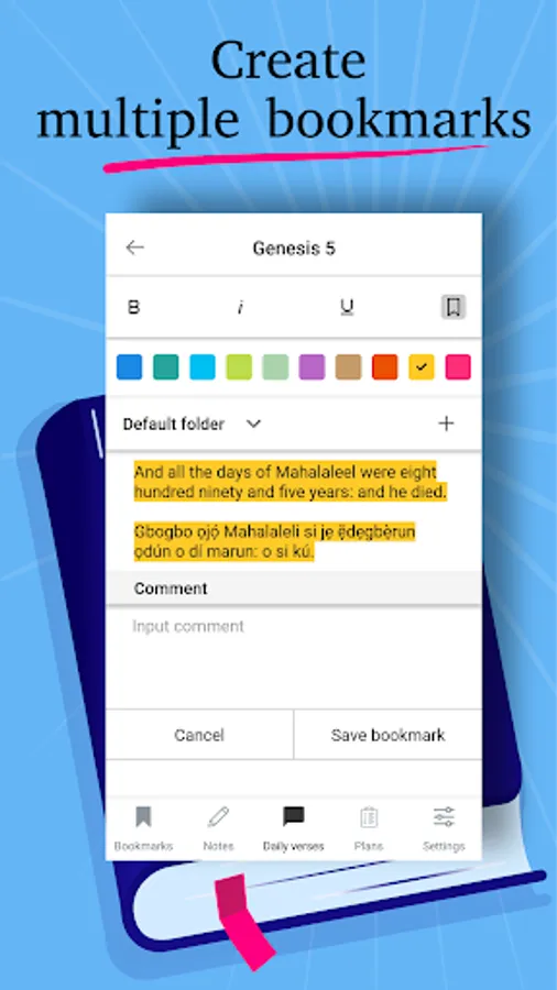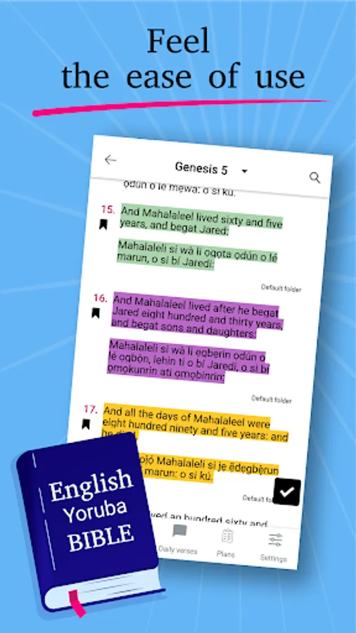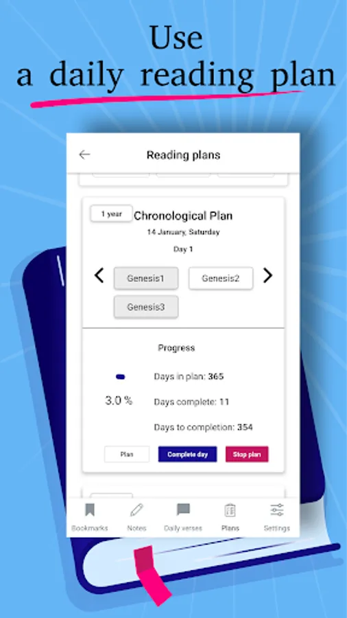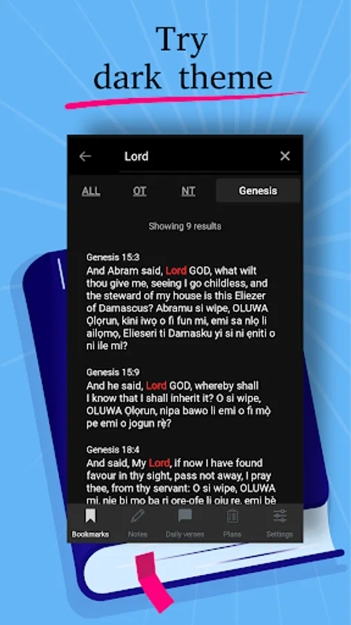 We offer a convenient app with which you can feel for free all the ease of using the Holy Bible without the Internet. We have added the ability to study the Bible with a smart daily reading plan to the app. You can refer to the verse of the day. Easily make lots of colored bookmarks and notes. Use a convenient search and set up a dark theme for a better perception of the text of the Bible.