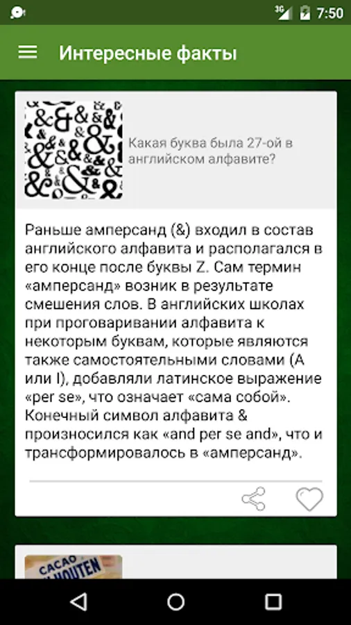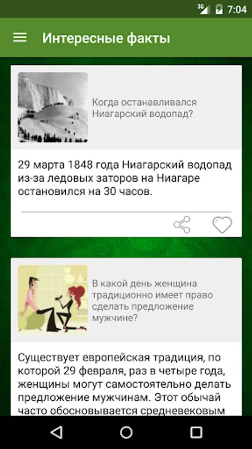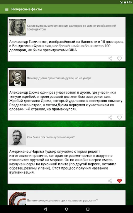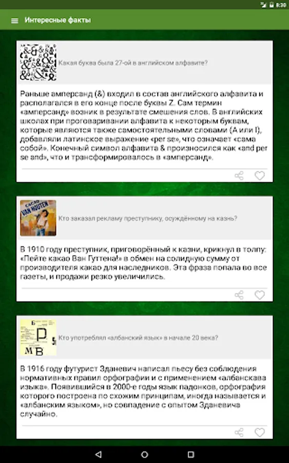 The application is directed to expanding your horizons, it raised a lot of interesting facts on various topics ranging from religion, ending insects. Programmers to use the material for design applications. There is a list of your favorite facts. It is also possible to share interesting facts through social networks such as facebook and VKontakte, etc., to share with him their new knowledge with their friends. Interesting to know any useful information, and even better it skillfully handle the dispute with the opponents are. Knowledge of many of the facts will help you in real life.