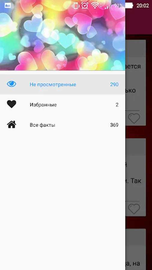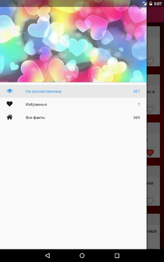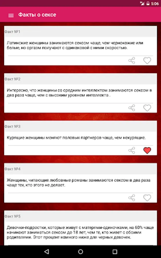 The application can be used during breaks, trips to the toilet, etc. With it easy to share the facts on social networks such as VKontakte and FEYSBUK. There is a list of liked vulgar facts, elements of which you add by clicking the heart personifying your love of this fact.