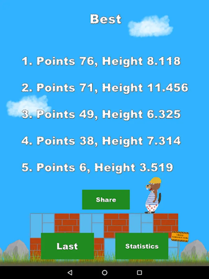 Construction is an extremely dangerous place for any beast, but Joe the beaver doesn’t care. In the forest, there is a shortage of housing for its inhabitants and our hero decided to rectify the matter. Help Joe build incredibly tall houses! Earn points and coins, unlock various visual elements and transform the world around you! Show your friends how cool you are - share your statistics or the best results with them.
