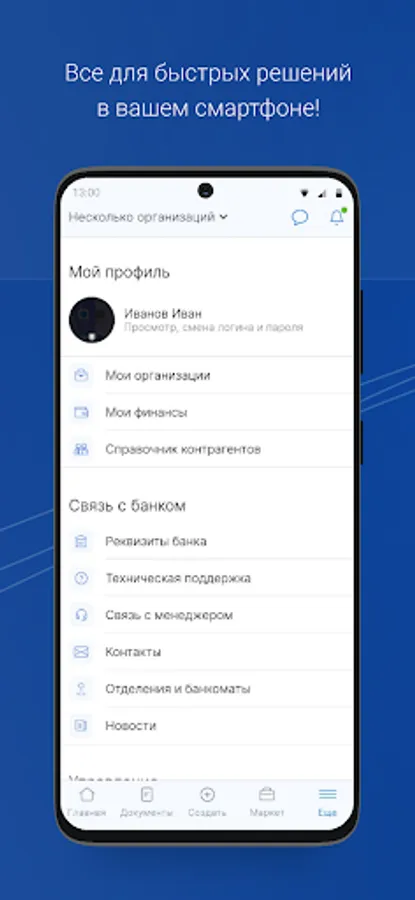 - подпись документов с помощью смс-кода и отправка их на исполнение в банк