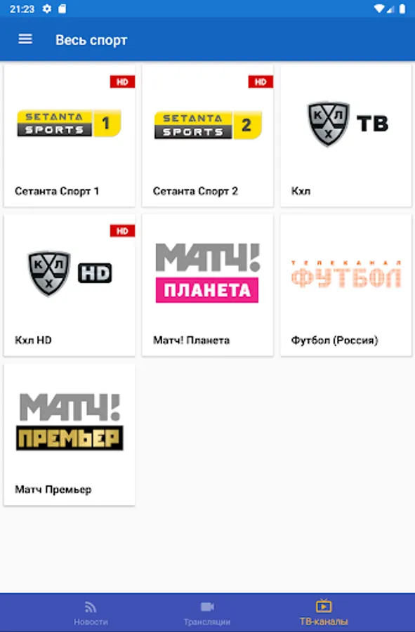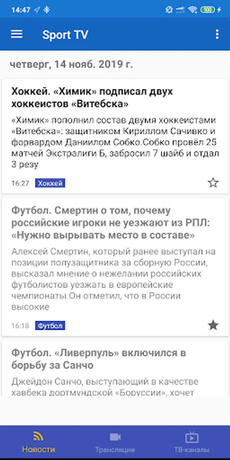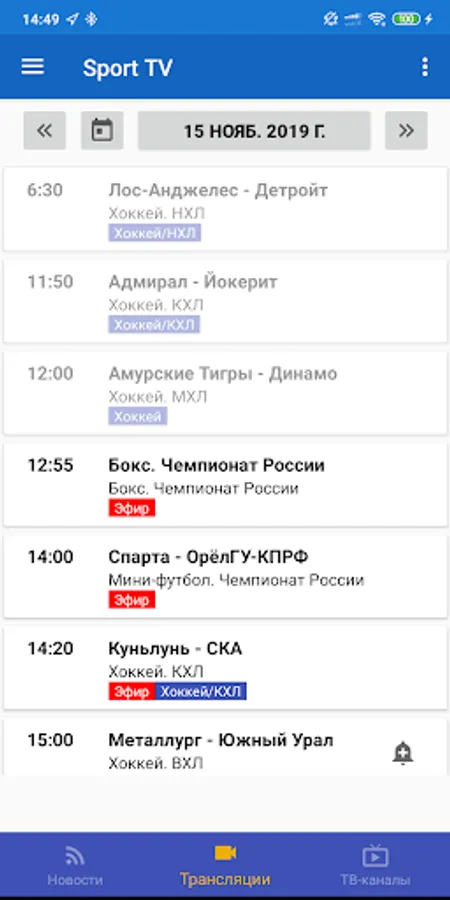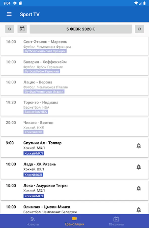 - Matches of hockey teams Extraligi (Championship of Belarus), KHL and NHL.