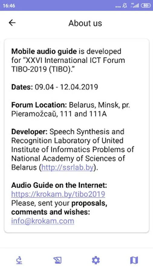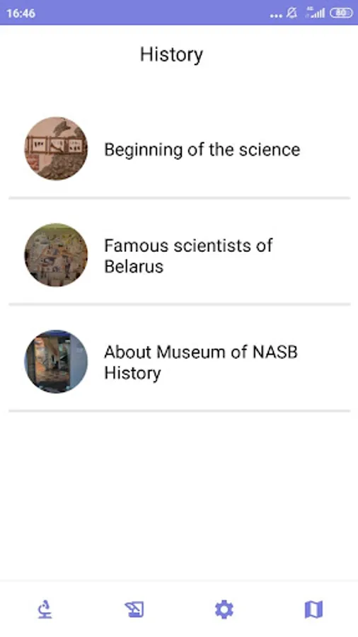 The audio guide to the museum of the National Academy of Sciences of Belarus. The mobile application "Museum of the National Academy of Sciences of Belarus" is intended for acquaintance with the part of the exhibition installation of the developments of the National Academy of Sciences of Belarus and with the part of the objects of the Museum of History of the National Academy of Sciences of Belarus.