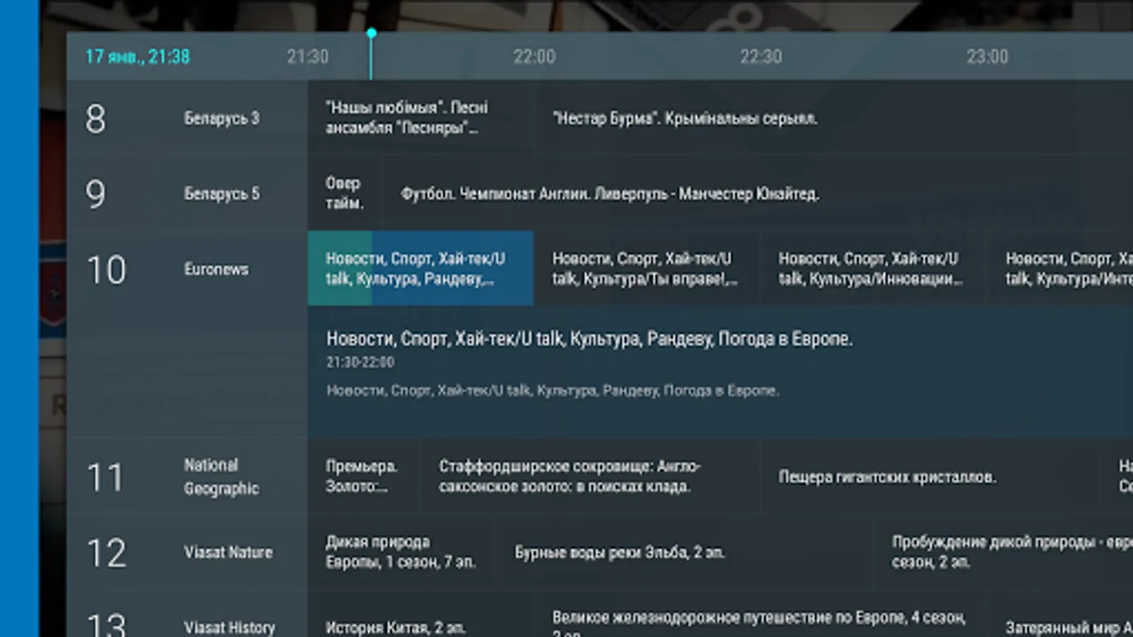 TVirl integrates IPTV channels from your internet provider or online service right into "Live Channels" which has beautiful and handy user interface developed specifically for big TV screens.