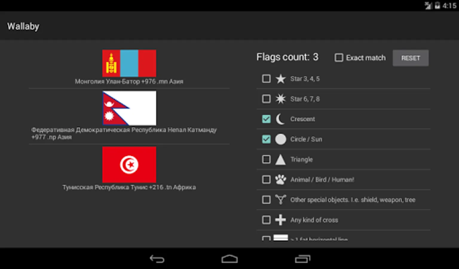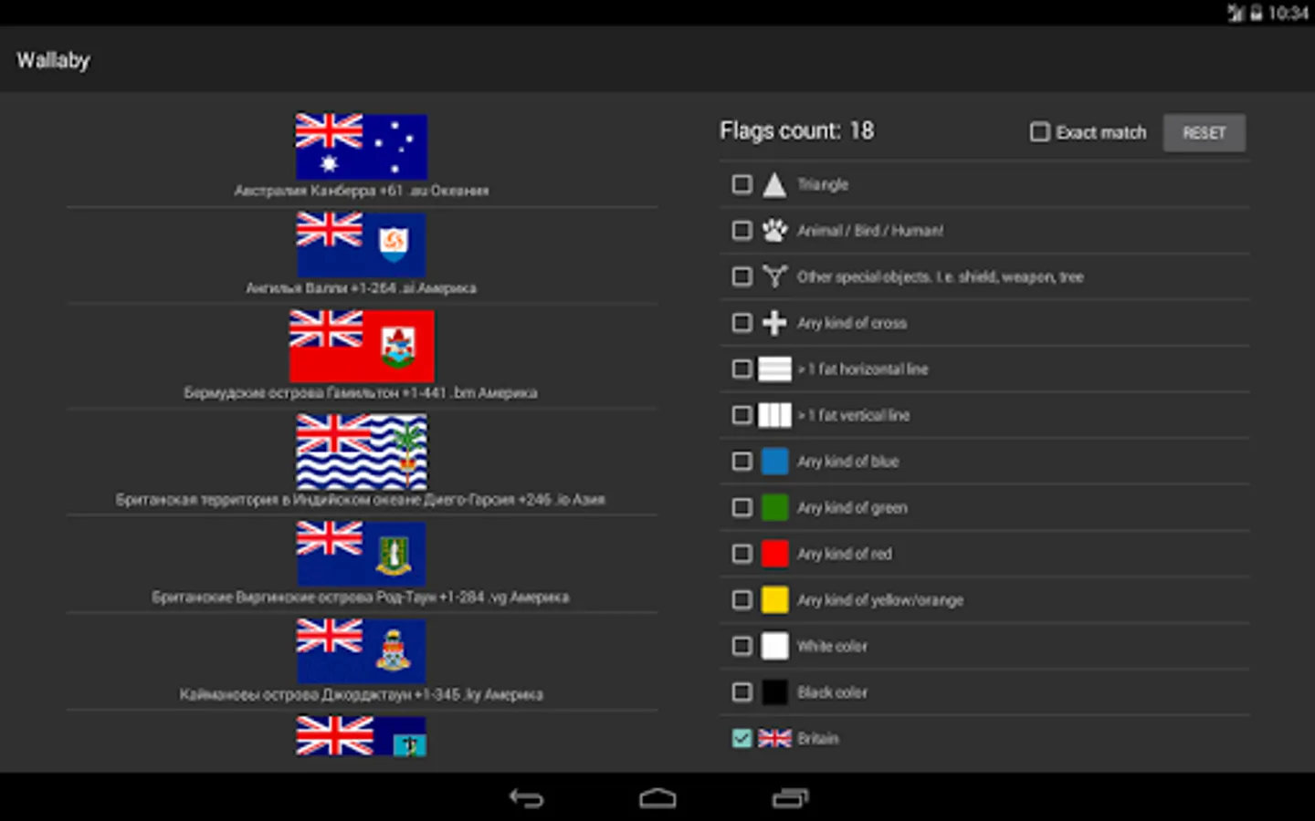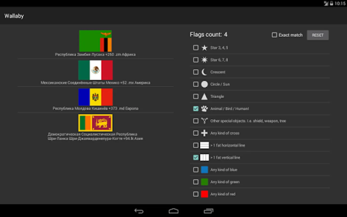 This application is designed to short-list country flags by their custom properties from predefined list. This is the initial release and can have misclassification. This application is open-source, so fill free to send pull requests at https://github.com/styx/wallaby