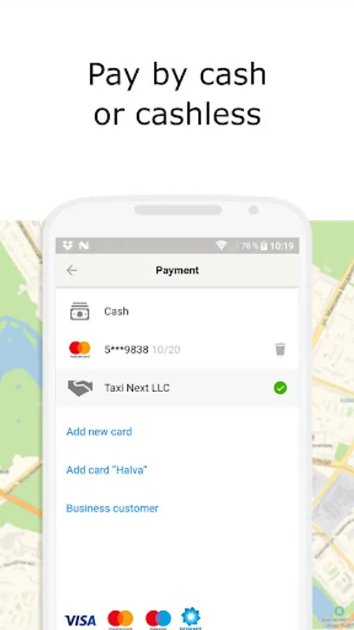 Tie the card in the app and forget about cash. At the end of the trip the cost will be written off the card automatically. There is a possibility to pay with a “Halva” card and a variant of cooperation with corporate clients.