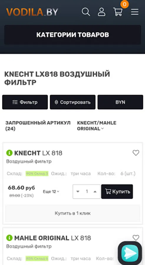 If you have an article, just enter it in the search bar and you will be offered all the options in Minsk warehouses, as well as on order.