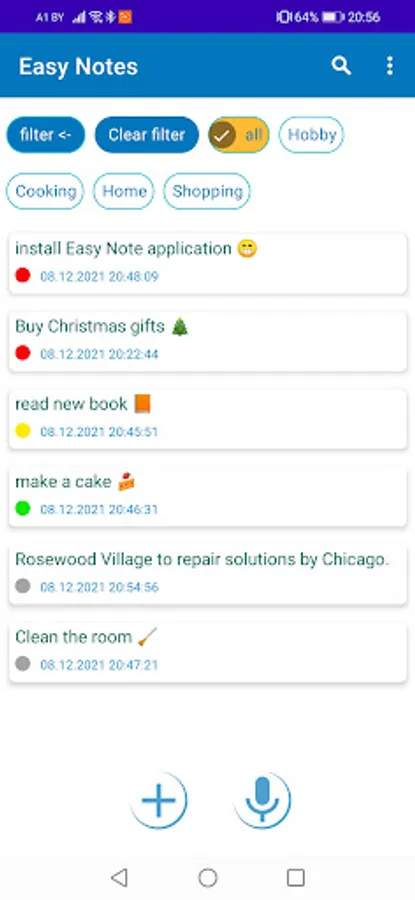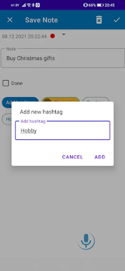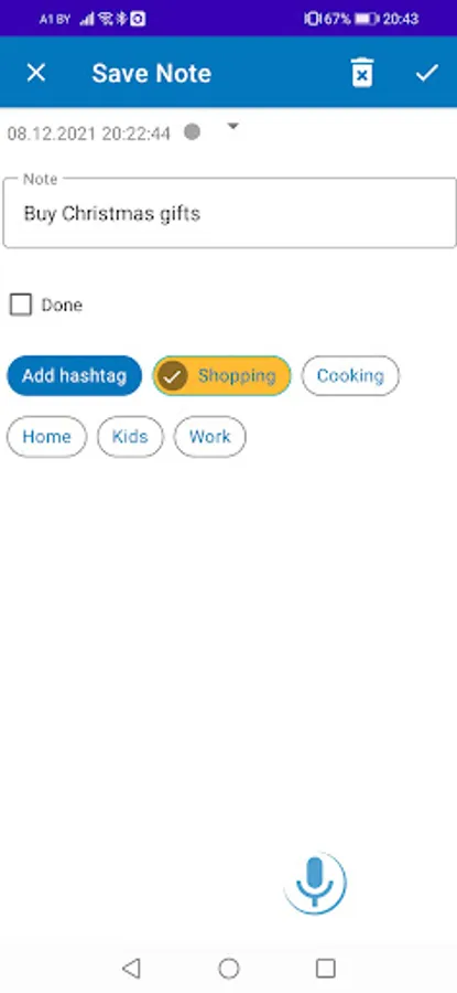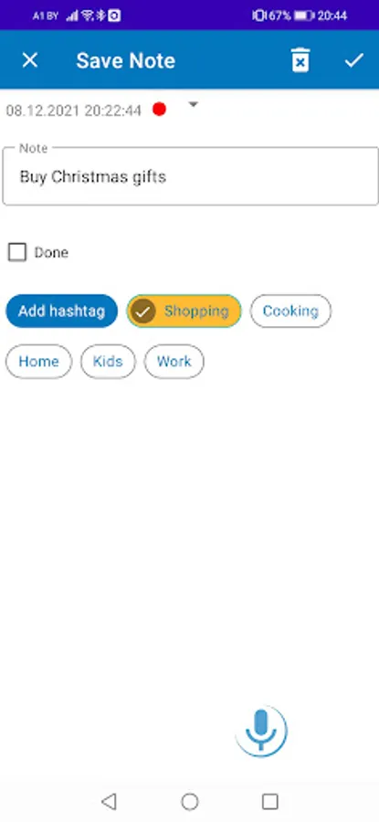 Create your personal Notes quick and easy just using your voice (Google app must be installed on your device ). No need using boring typing anymore. Create your own hashtags, add them to your Notes by voice (just say the phrase "hashtag work" or "hashtag shopping" for example. You can use so many hashtags (work, shopping, kids ... ) as you like).