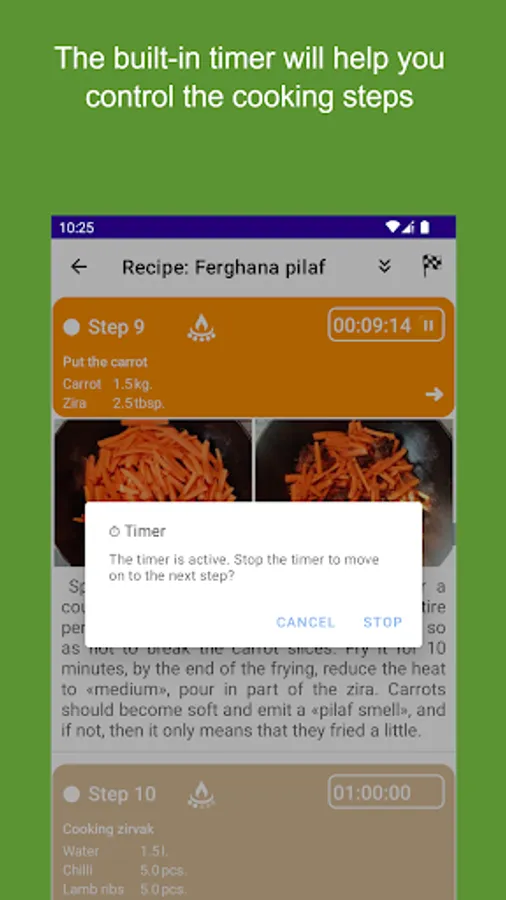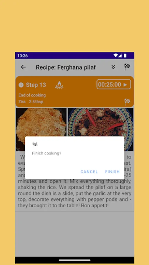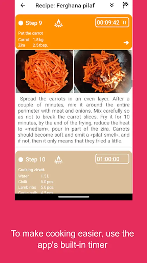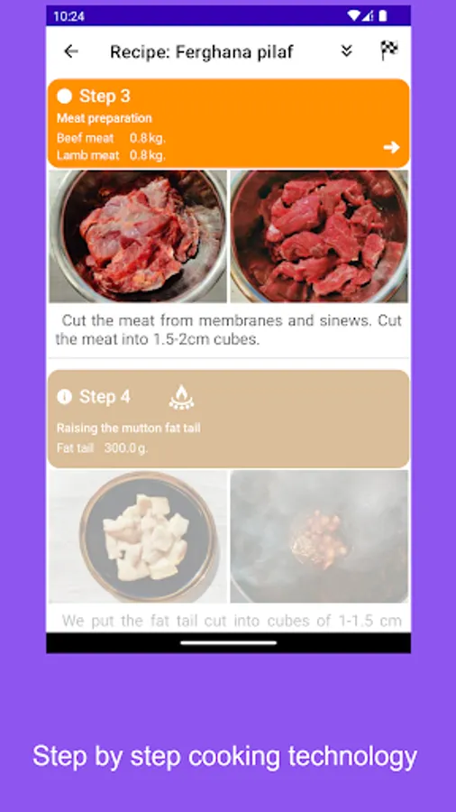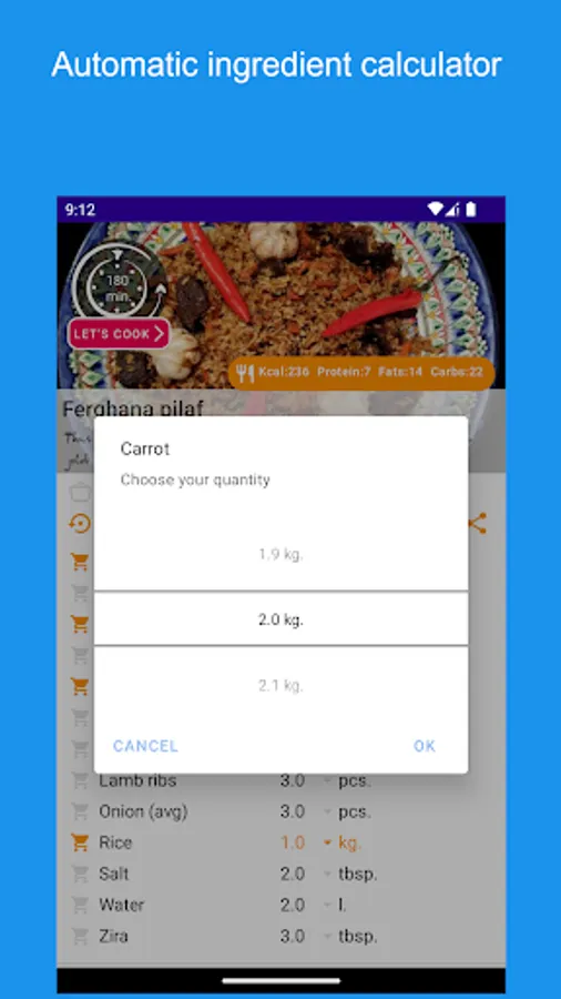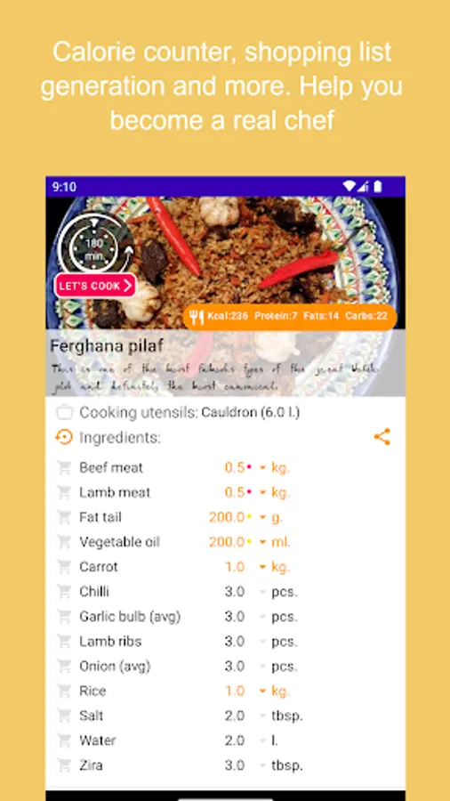 A step-by-step interactive recipe for the world-famous Ferghana pilaf with convenient timing and informative photos. This application will help you prepare a delicious dish even for a beginner from the first time. Just follow the recipe step by step and you will be fine. It is possible to calculate the amount of necessary ingredients and make a list of missing products, choose the most appropriate size of dishes (cauldron) depending on the required amount of pilaf. Also, the application will automatically calculate for you the calorie content (calories, fats, proteins, carbohydrates) in 100 g of the finished dish.
