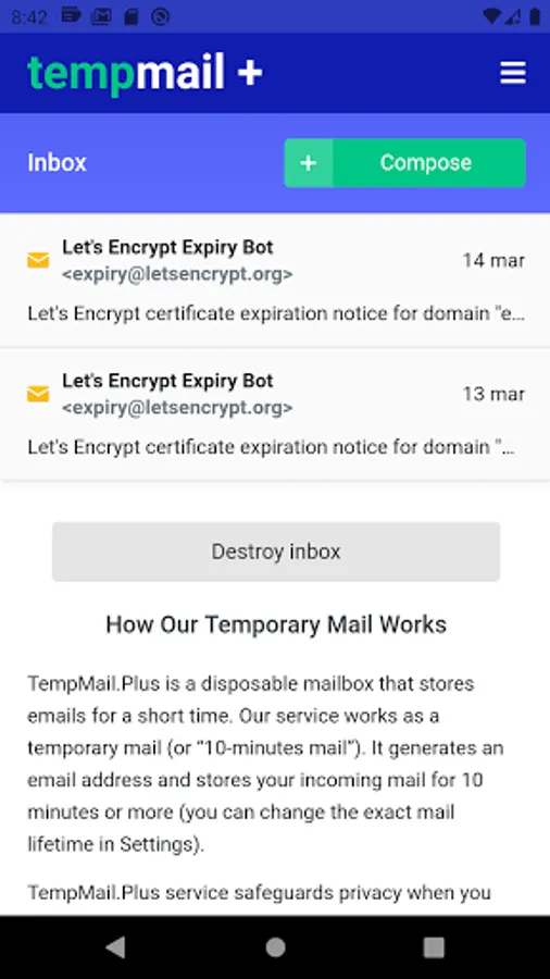 TempMail.Plus is a disposable mailbox that stores emails for a short time. Our service works as a temporary mail (or “10-minutes mail”). It generates an email address and stores your incoming mail for 10 minutes or more (you can change the exact mail lifetime in Settings).