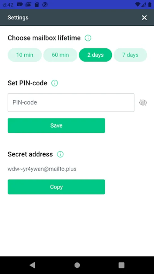 You can protect your temporary mail by setting a PIN-code or using the generated secret address. These features are accessible in the settings.