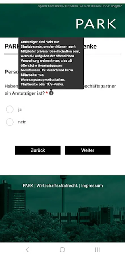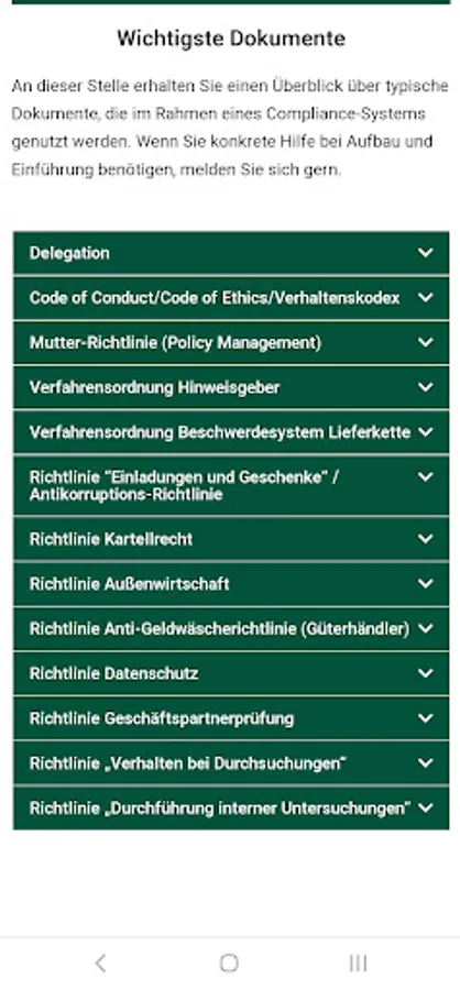 The app gives you hints, but also provides you with tools for risk assessment, assessing gifts and entertainment (corruption) and suspicious money laundering reports. So you are on the safe side.
