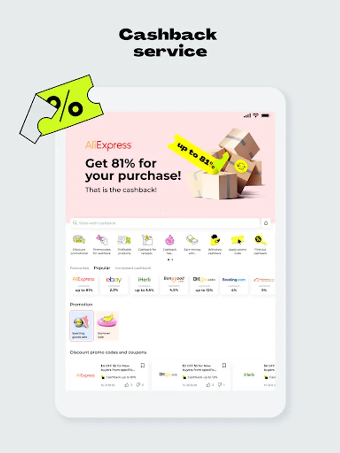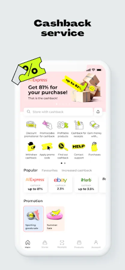 By the way, you can track down hot offers and discounts in your smartphone: for example, “increased Ali cashback” or “double cash back at eBay” and other limited special offers. The service will notify you about an opportunity to get greater cashback Aliexpress and in other stores, as well as about sales and best offers.