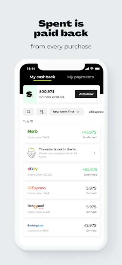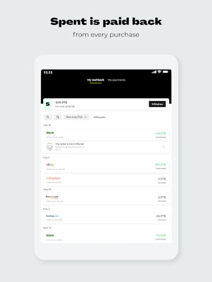 Now you can track down your order statistics for previous 180 days and see all products with additional cashback. Don`t seize the opportunity to refund up to 90% of money spent!