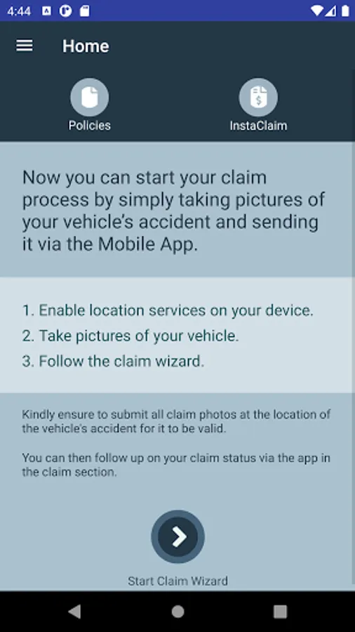 The mobile app also features the ability to start a claim process by submitting information of an accident.