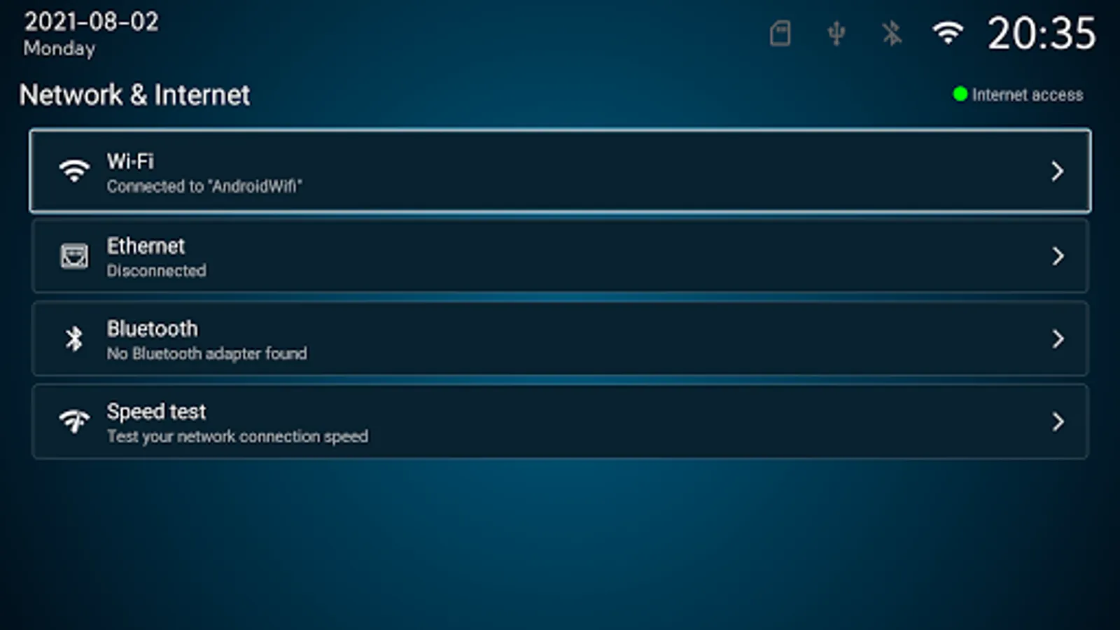 - In-app Network settings (Ethernet, Wi-Fi, Bluetooth)