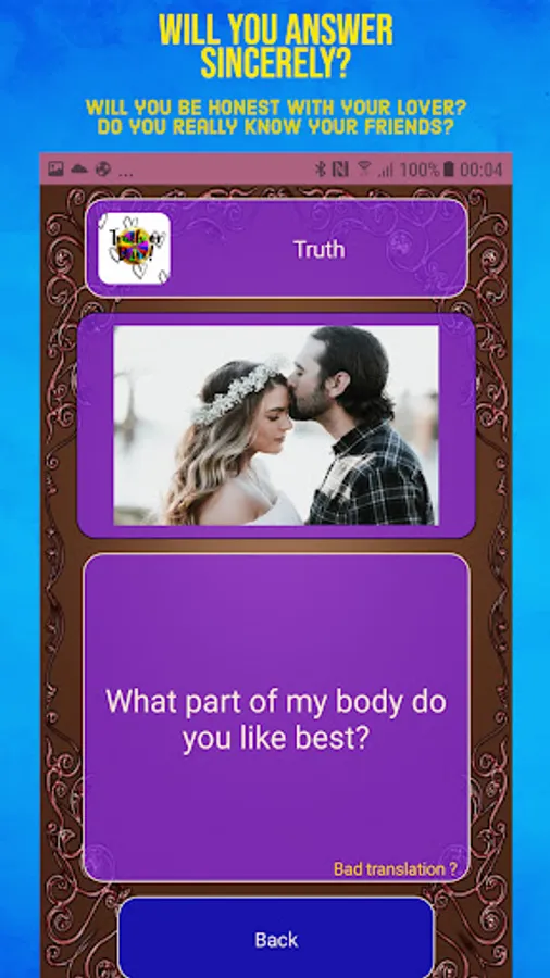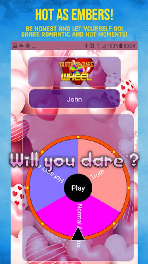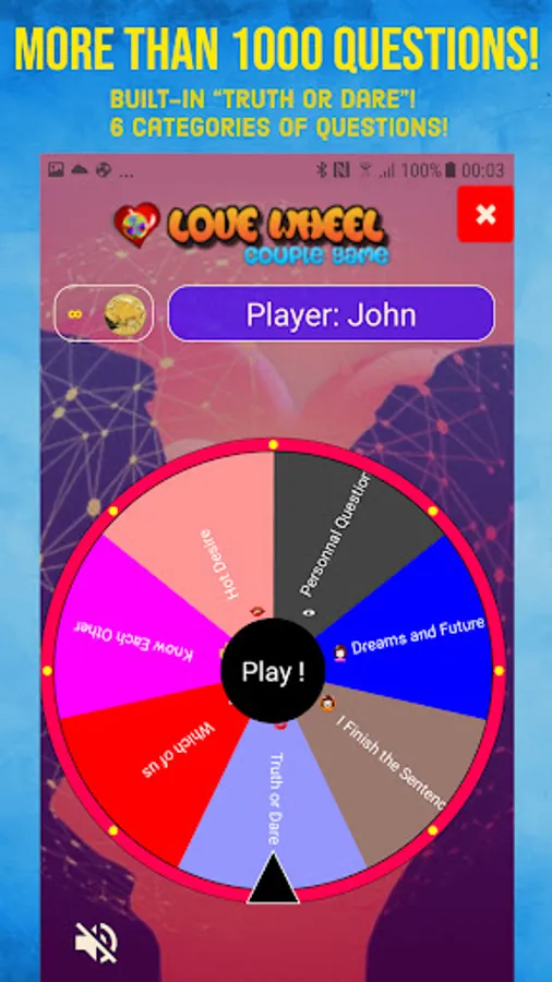 Welcome to Love Wheel Couple Game! A question game for couples and friends, which will allow you to get to know each other better around crispy questions. Will you dare to be honest with your lover and friends?