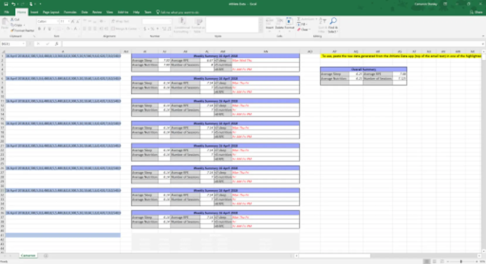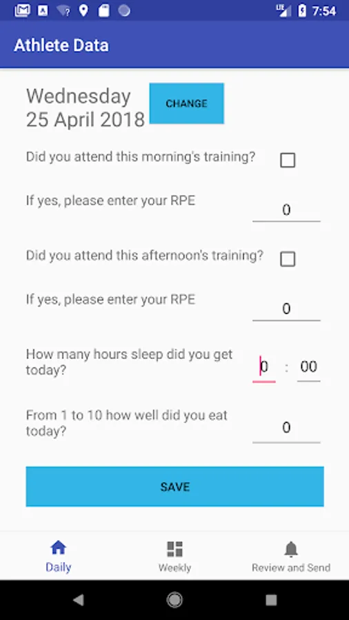 Athletes enter data daily into the app about whether they attended the session, their rate of perceived exertion (RPE), the number of hours sleep they got, and a nutrition rating from 1 to 10. In addition, at the end of each week there is a weekly goal review that asks the athlete three questions about their progress towards their goals during the week.
