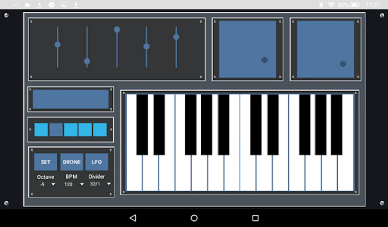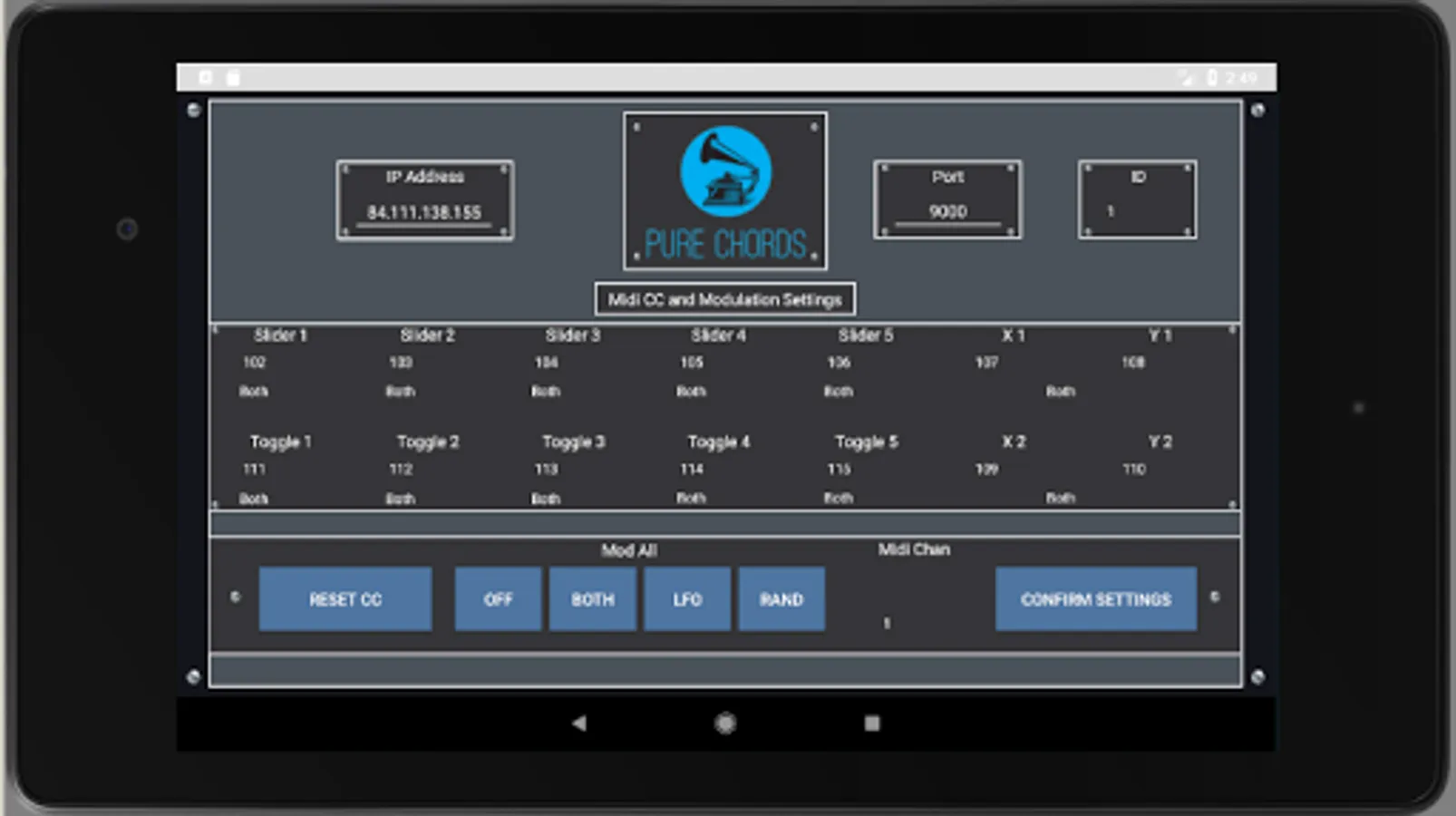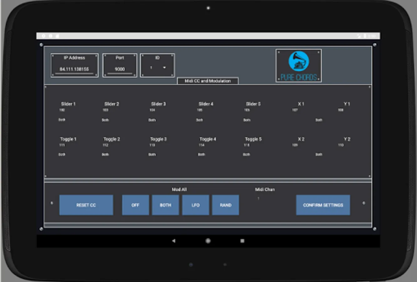 Pure Chords lets you control any MIDI capable software of hardware with your Android phone or tablet. The app includes a two octave keyboard, five sliders, five toggle switches, and two x/y grids. A randomizing LFO and a randomize button allow for unique experimentation, and the keyboard can be placed in a special drone mode.