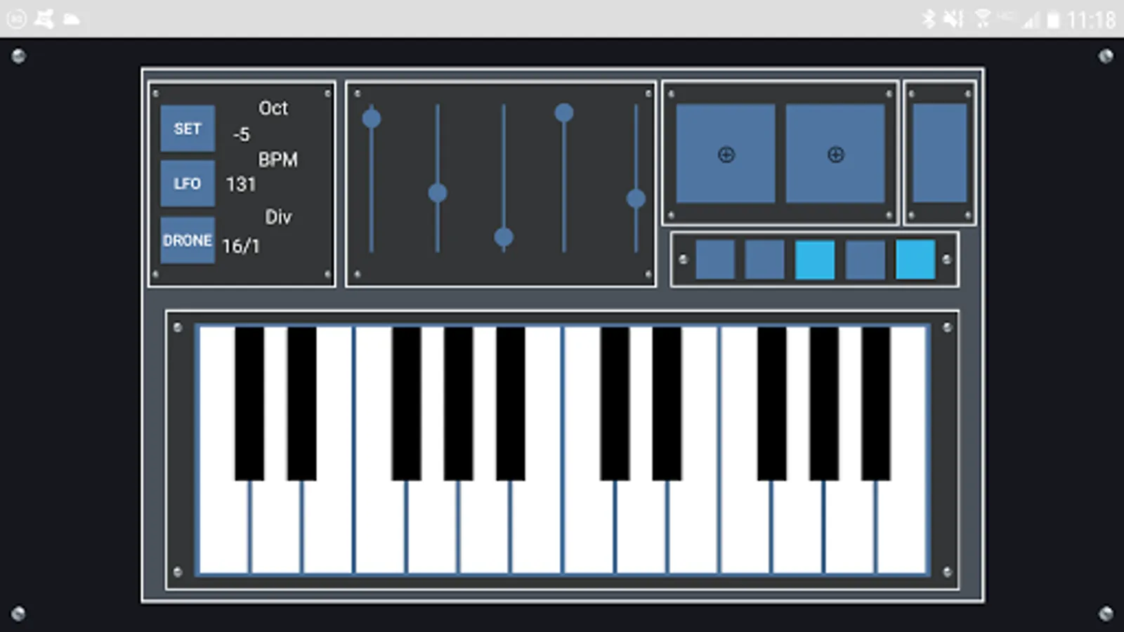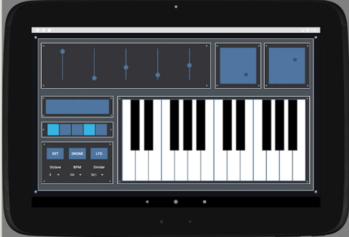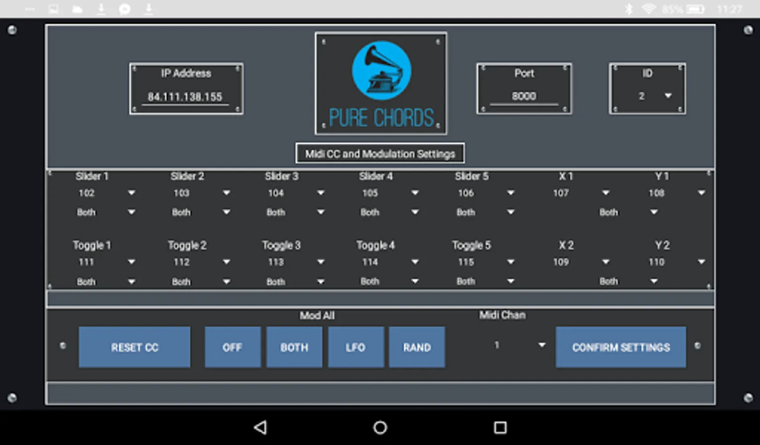 Pure Chords lets you control any MIDI capable software of hardware with your Android phone or tablet. The app includes a two octave keyboard, five sliders, five toggle switches, and two x/y grids. A randomizing LFO and a randomize button allow for unique experimentation, and the keyboard can be placed in a special drone mode.
