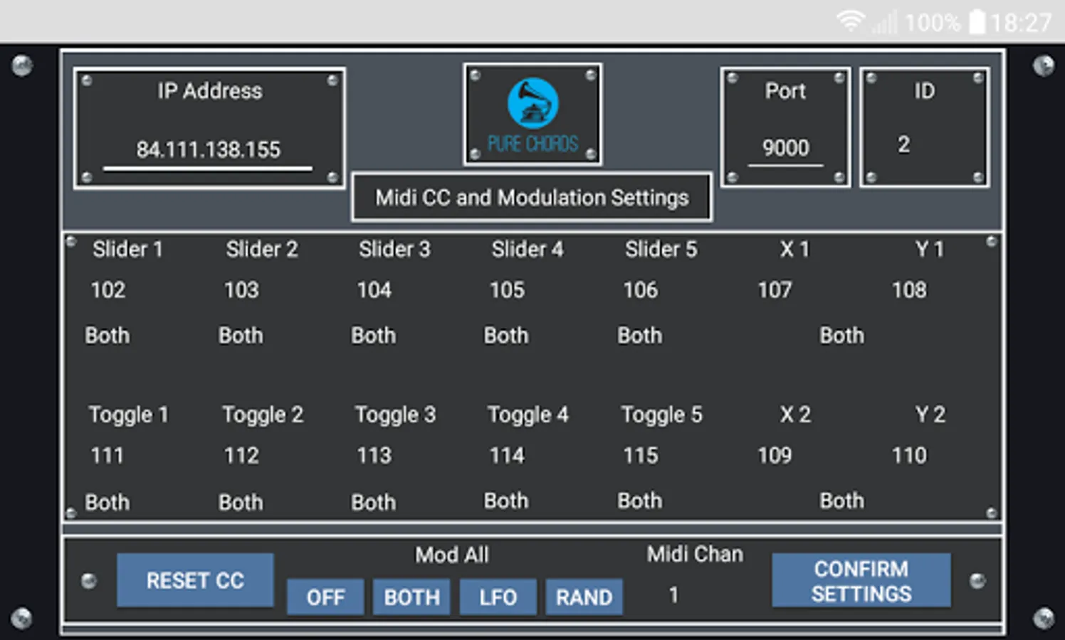 Pure Chords works by communicating MIDI information over the network between the app and a server on the computer that listens to and manages incoming data from the app. You can choose from various servers depending on your workflow, the programs you use and your preference. At the moment the options include a dedicated Max4Live device for working in Ableton, a dedicated device device for the Sonic Core Scope system and a generic standalone server that is independent of any specific program.