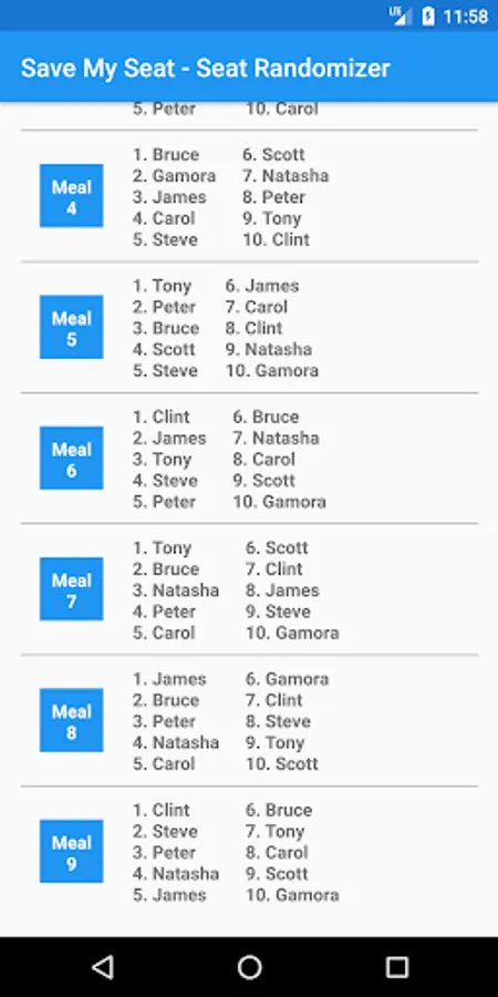 Heading out on a cruise with a group of friends and you want to shake up the seating plan for meals? No worries, we've got you covered. Give us a list of names, along with the number of meals you are expecting and we'll generate a random seating plan for each meal.