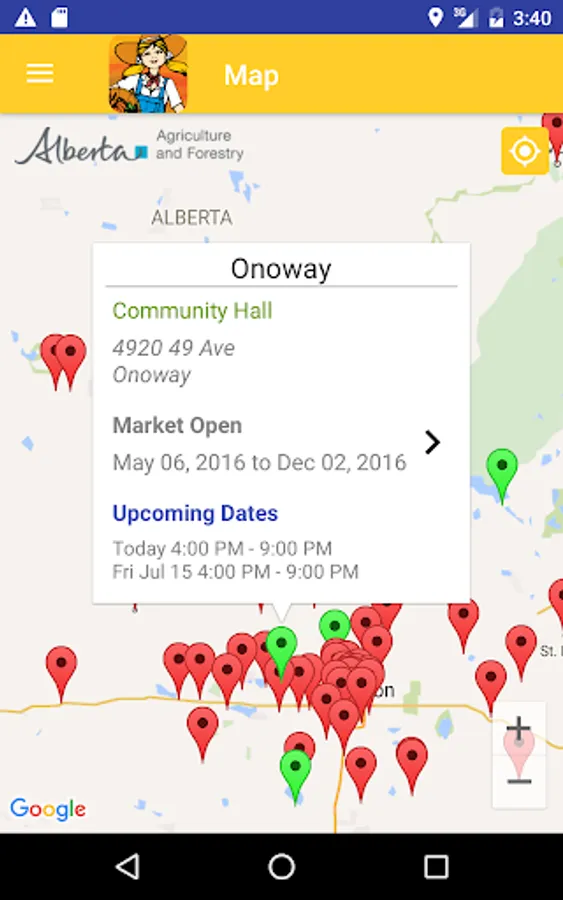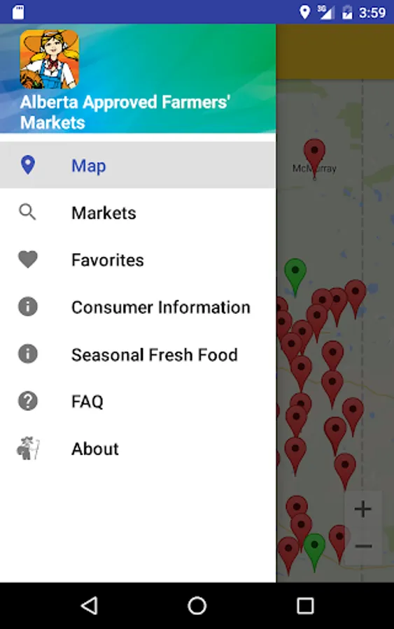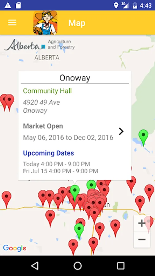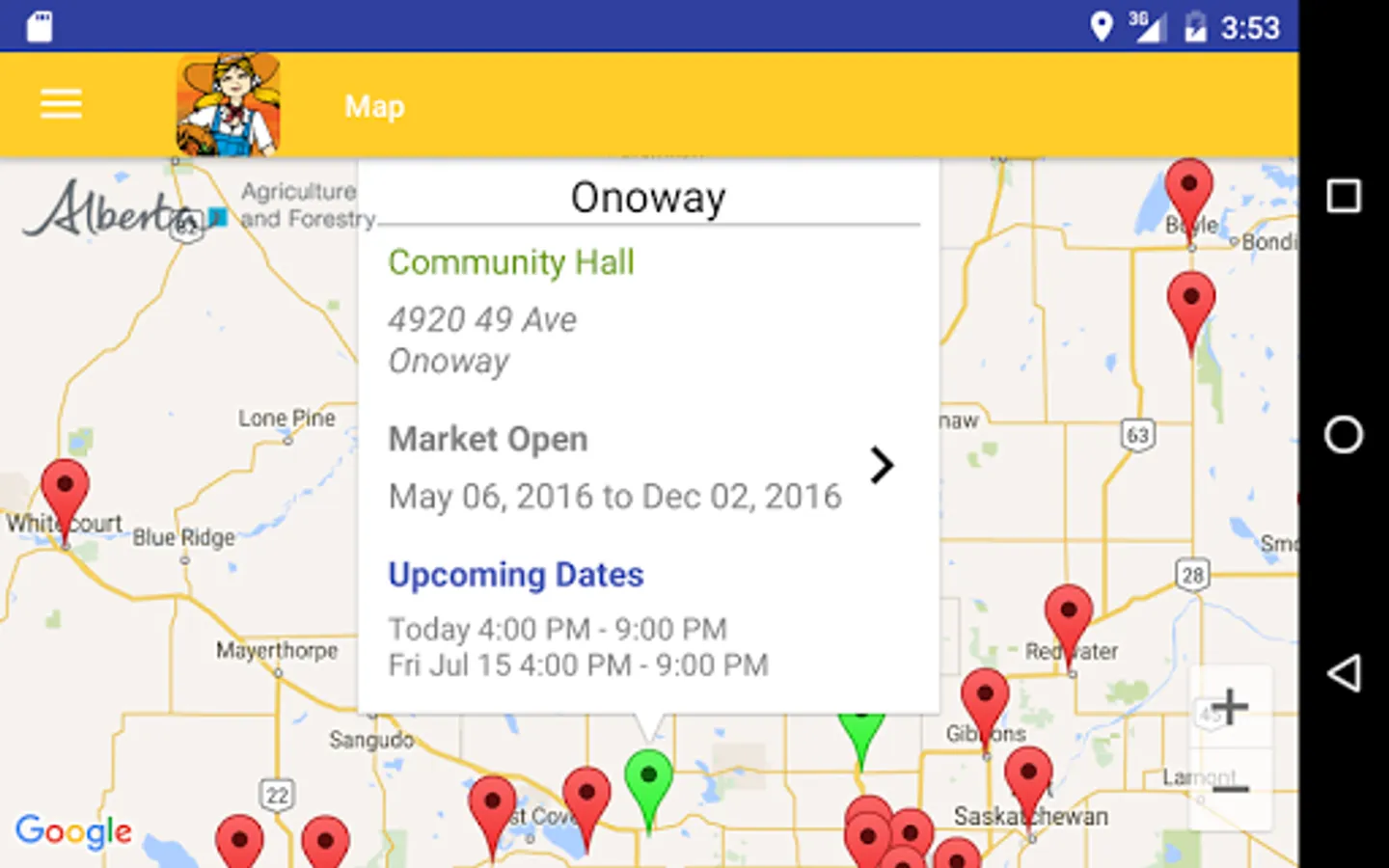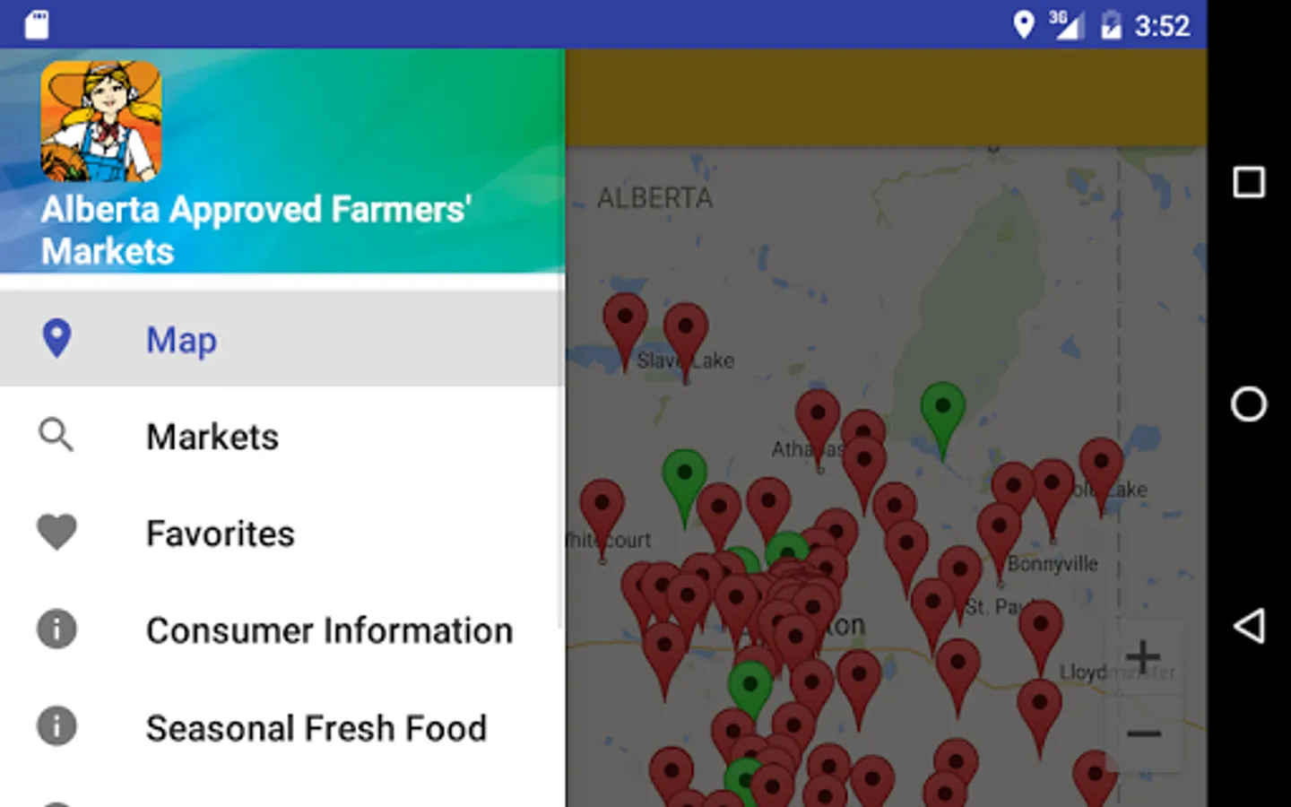 This Alberta Farmers’ Market application guides you to your nearest Alberta approved farmers’ market. The application uses your present location to map all local Alberta approved farmers’ markets with information on each market and links to websites and social media when available. The data is provided by the Ministry of Agriculture and Forestry in Alberta, Canada.