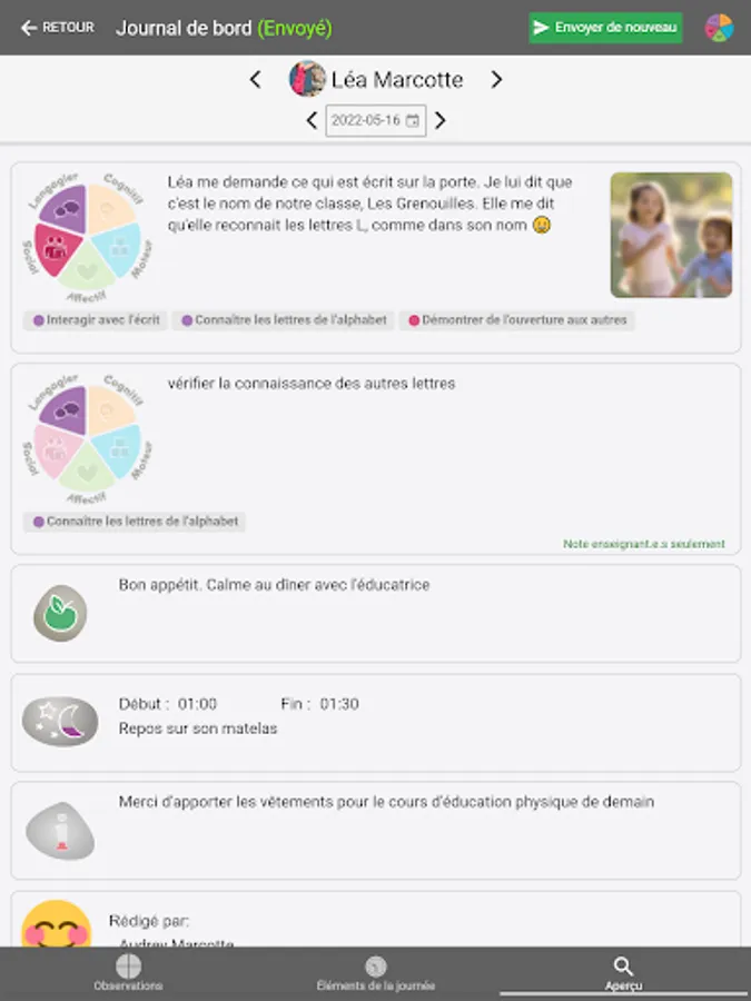 With the À petits pas logbook, follow the progress of the child through the lens of the 5 dimensions of his development (language, cognitive, social, affective and motor) as defined by the Preschool Cycle Program. Place observation at the heart of the educational process and promote the quality of your teaching practices.