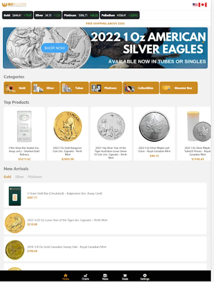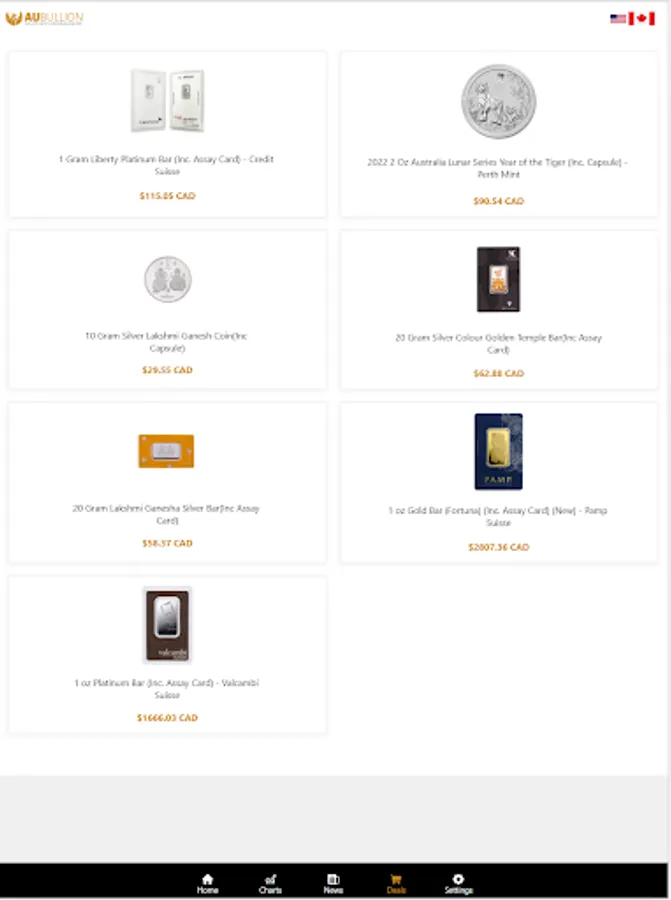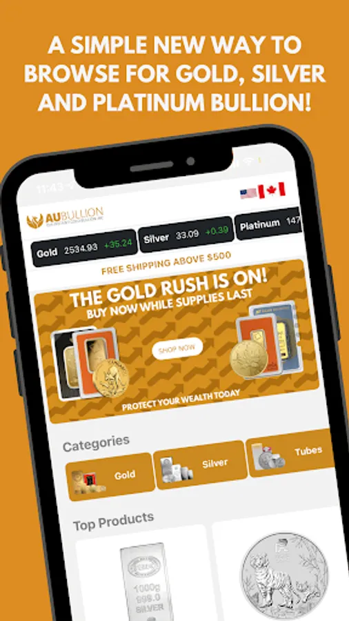 nvest in physical gold, silver, and platinum securely with ease with the AUBULLION mobile app. AUBULLION is Canada’s Premier Precious Metals retailer. Stay alert with live prices of Gold, Silver, Platinum and Palladium with our live spot charts. Review the latest news about precious metals and the financial markets with our news section. Set your own spot alerts within our integrated website! View our amazing selection of Gold, Silver and Platinum bullion products with our integrated site directly on the app! AU BULLION offers a wide range of inventory in Canada from some of the world biggest and trusted precious metals mints and refineries.
