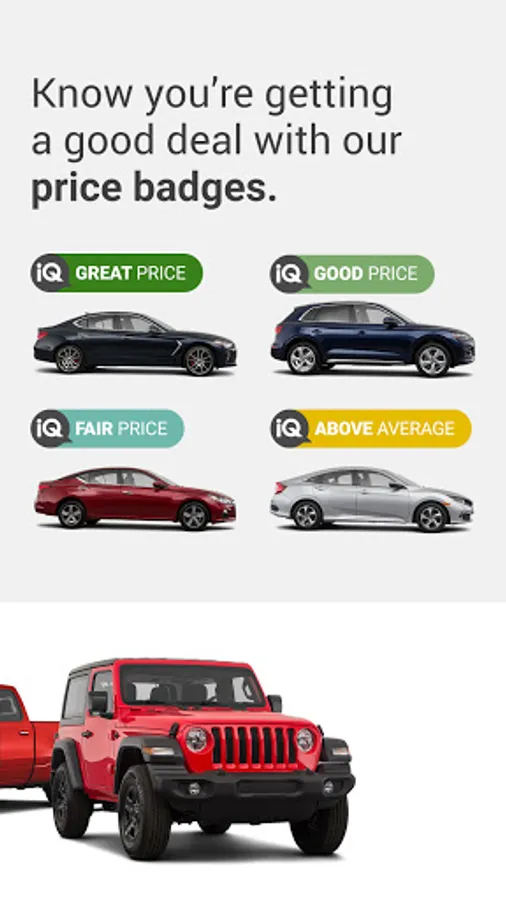 • Price transparency - We will let you know whether the price of a car is Great, Good, Fair or Above Average by comparing millions of cars using live market data