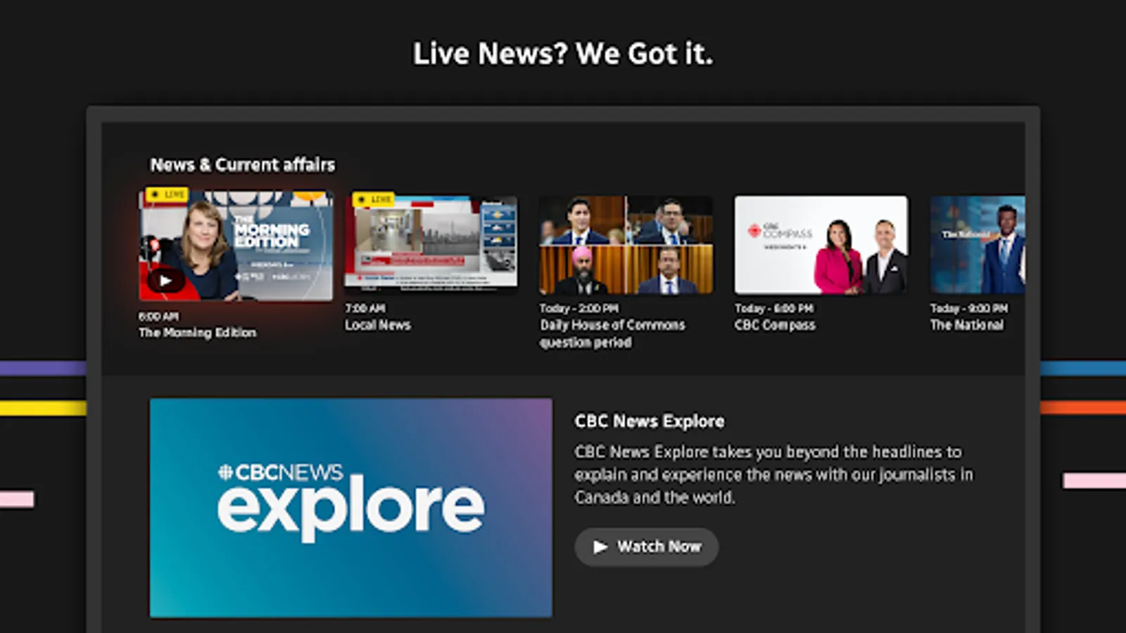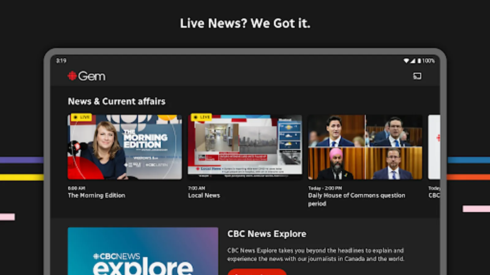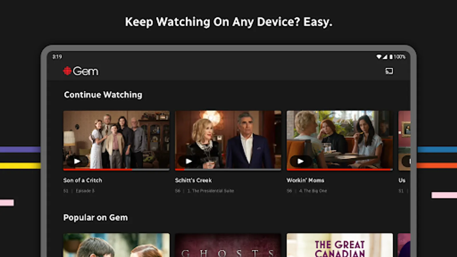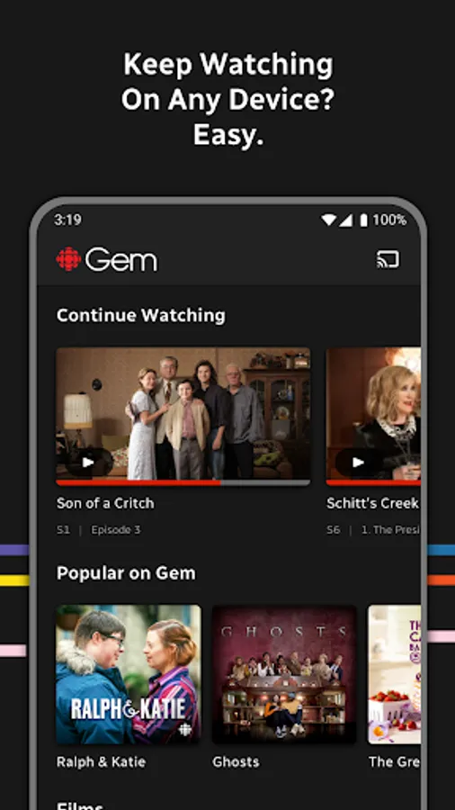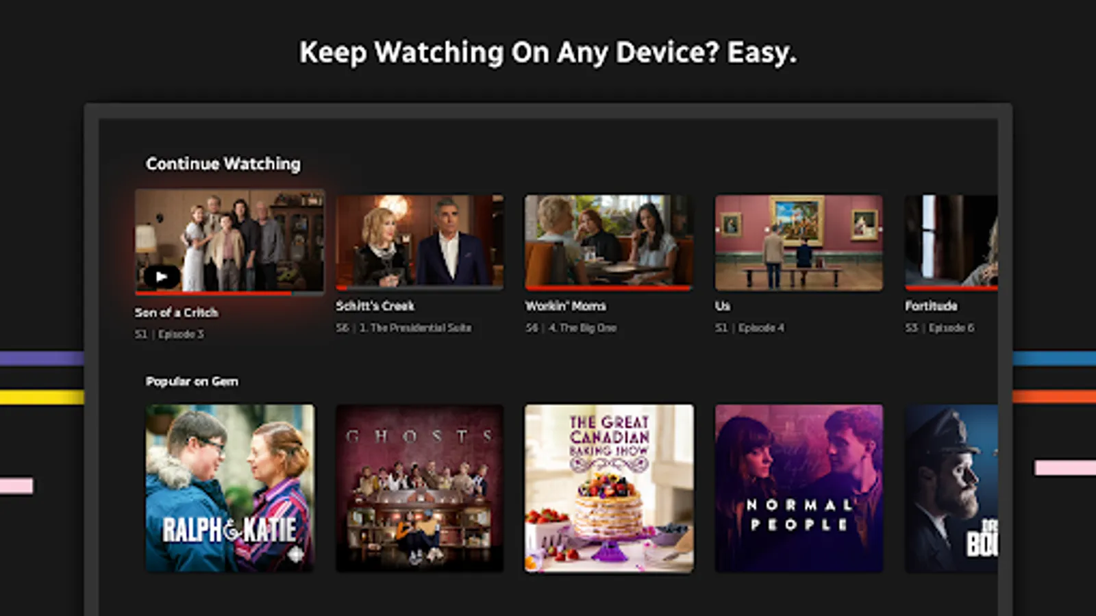 Watch the best shows and movies from across Canada and around the world - all for free. Not only can you watch hundreds of your favourite episodes of shows on demand, you can watch CBC TV live. CBC Gem is home to hit CBC TV shows like Sort Of, Son of a Critch and The Great Canadian Baking Show, along with exclusive series like Normal People, Ghosts, and more.