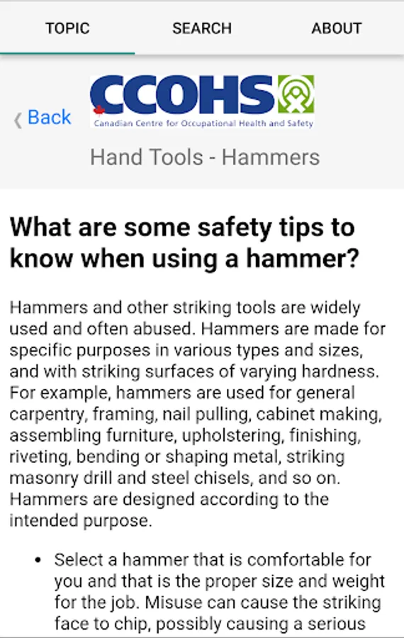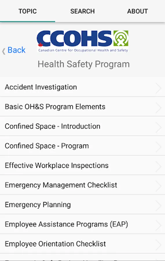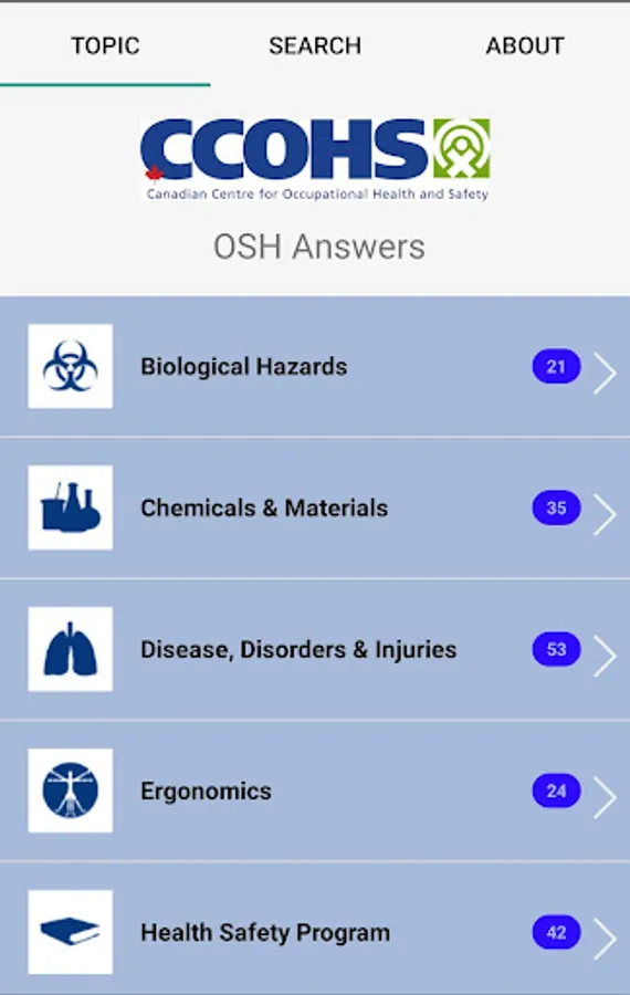 Getting answers to your health and safety question is now more convenient than ever. The OSH Answers App contains the entire collection of OSH Answers fact sheets that are available currently on the Canadian Centre for Occupational Health and Safety (CCOHS) website – almost 600 in total. Used worldwide by millions of users, these practical, easy-to-read fact sheets are trusted, reliable sources of health and safety information on a wide variety of topics. The fact sheets are organized by major subject areas, plus there's a handy search box so you can find answers even faster.