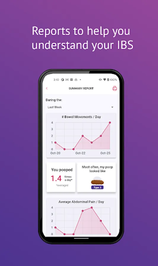 MyIBS app is designed to help you understand your IBS better so you can play an active role in your symptom management, but it does not provide medical advice. Use this app to help you have more detailed discussions with your doctor. Always consult with your doctor directly before making any changes to your diet or health.