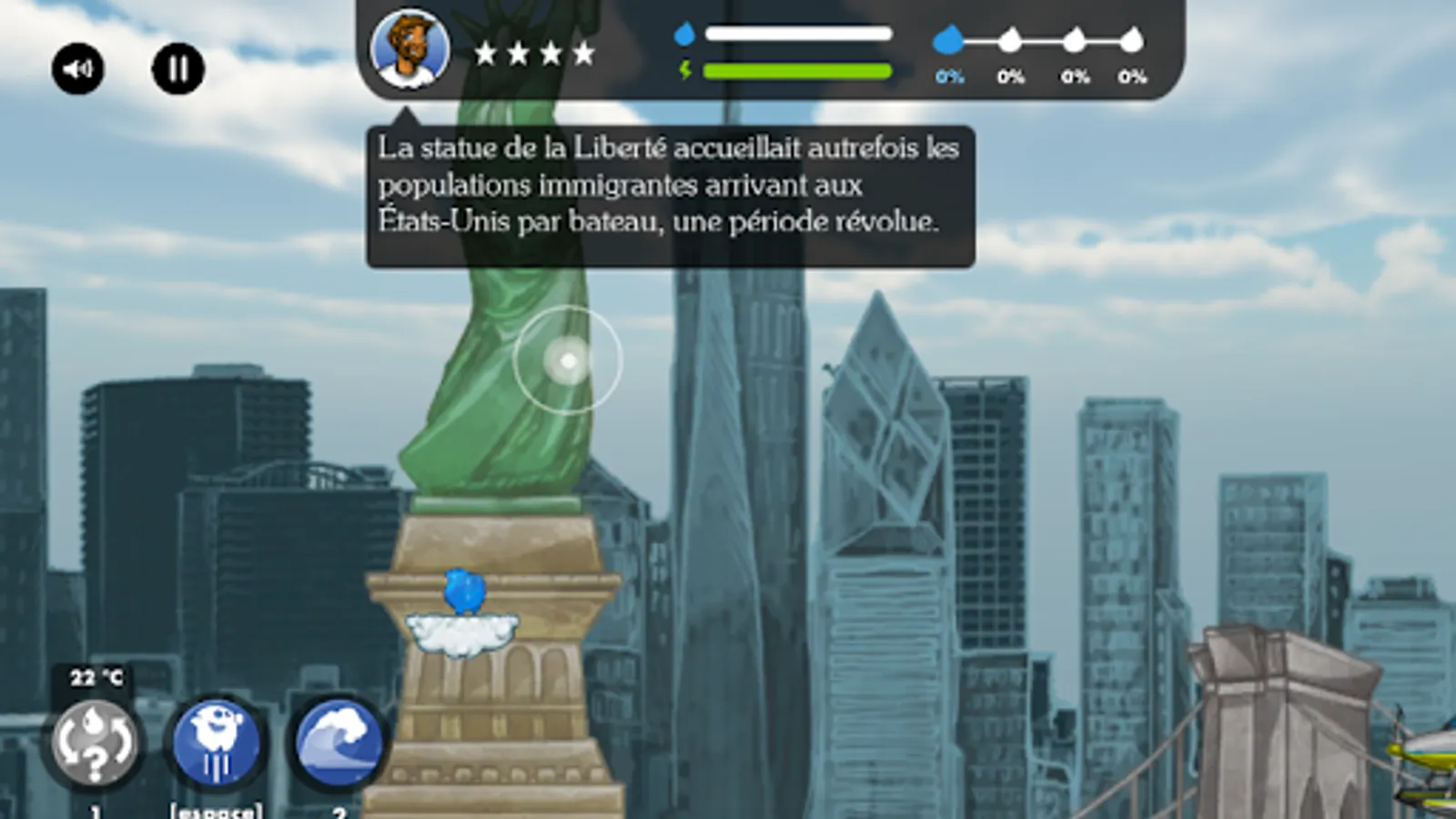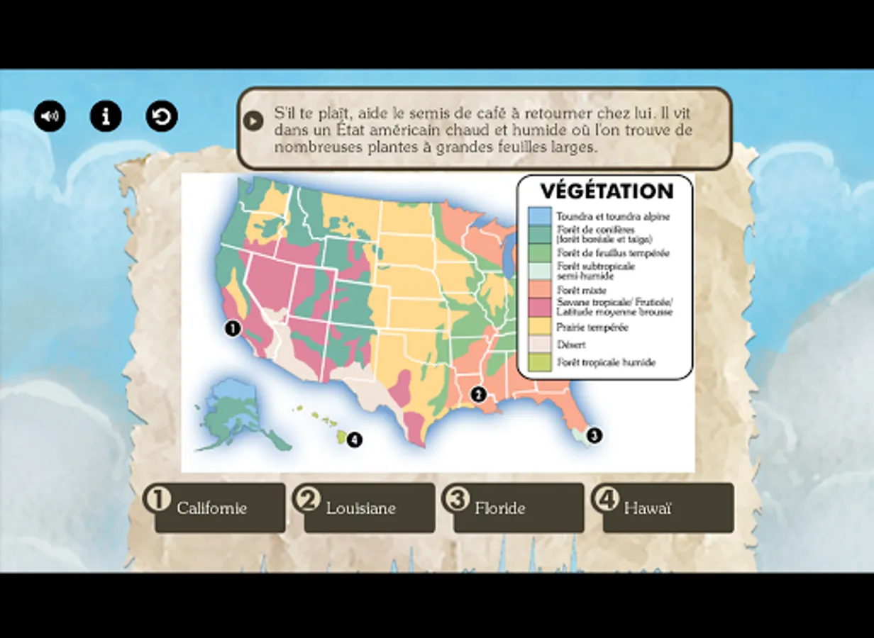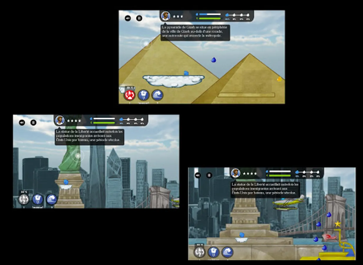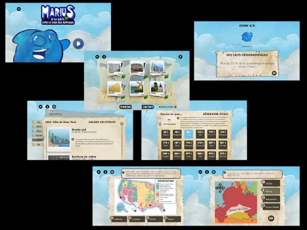 Students are directed to six different geographic locations re-imagined as a 2D playground. Map and graphic literacy of questions, facts and collection of items create moments of explicit learning; The game component allows players to move Marius, jump, and use water and state shift powers to alter the terrain and / or move forward in their quest. The goal is for students to gain experience with geographic features and relationships to real world places.