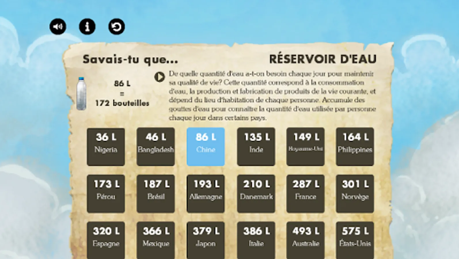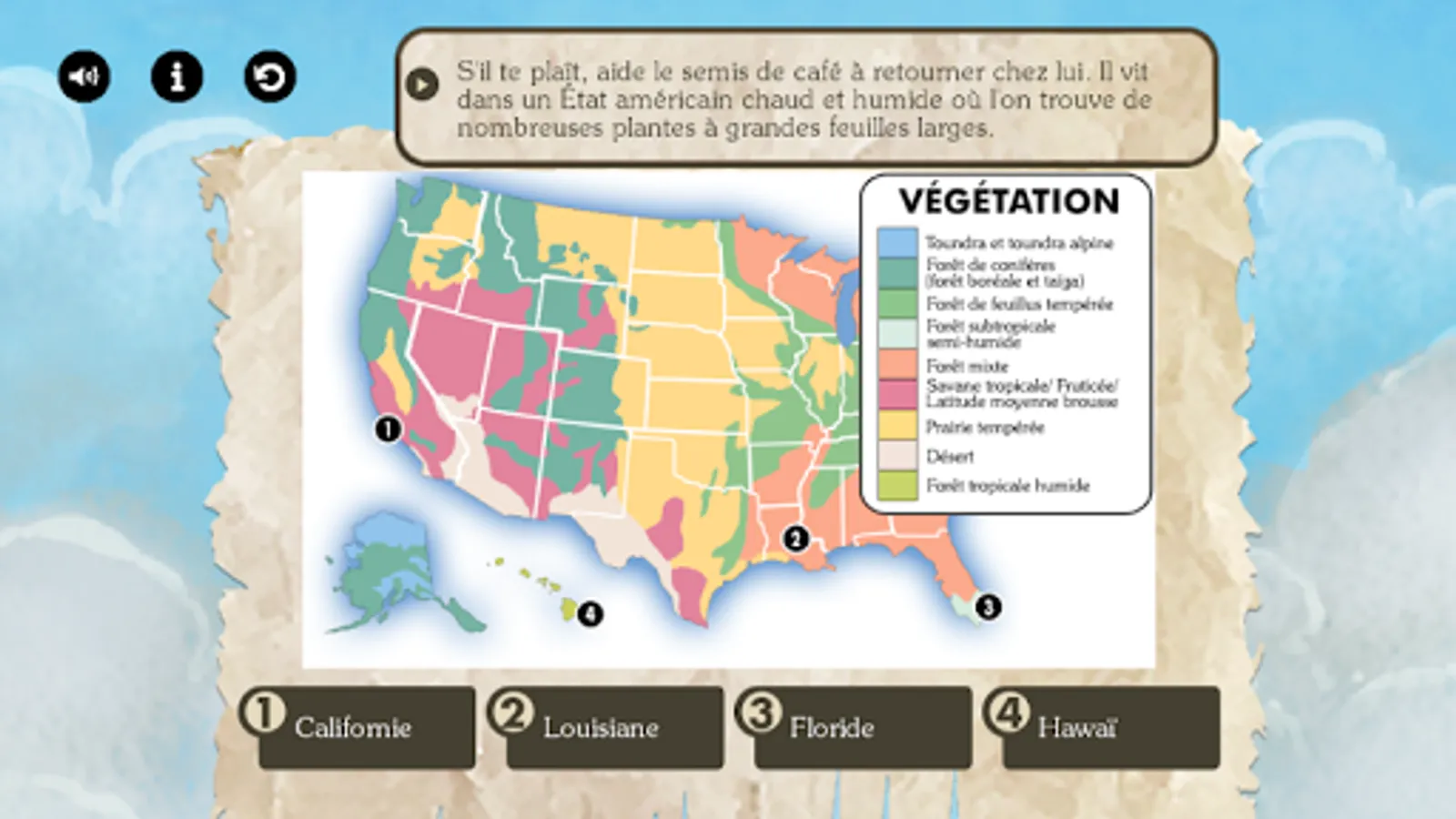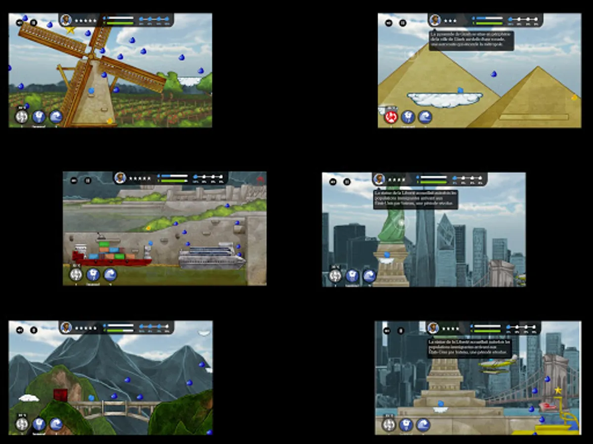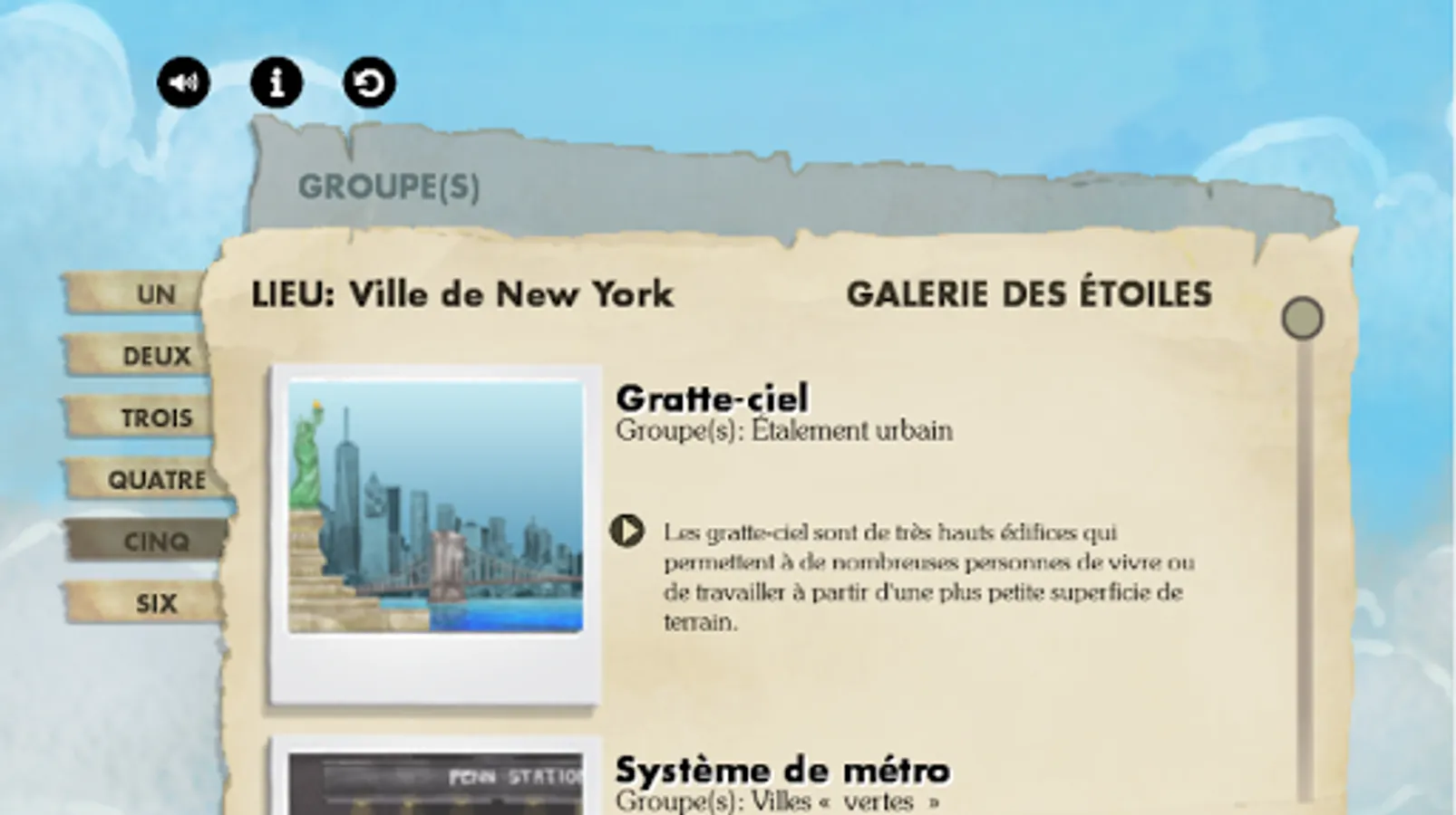 Students are directed to six different geographic locations re-imagined as a 2D playground. Map and graphic literacy of questions, facts and collection of items create moments of explicit learning; The game component allows players to move Marius, jump, and use water and state shift powers to alter the terrain and / or move forward in their quest. The goal is for students to gain experience with geographic features and relationships to real world places.