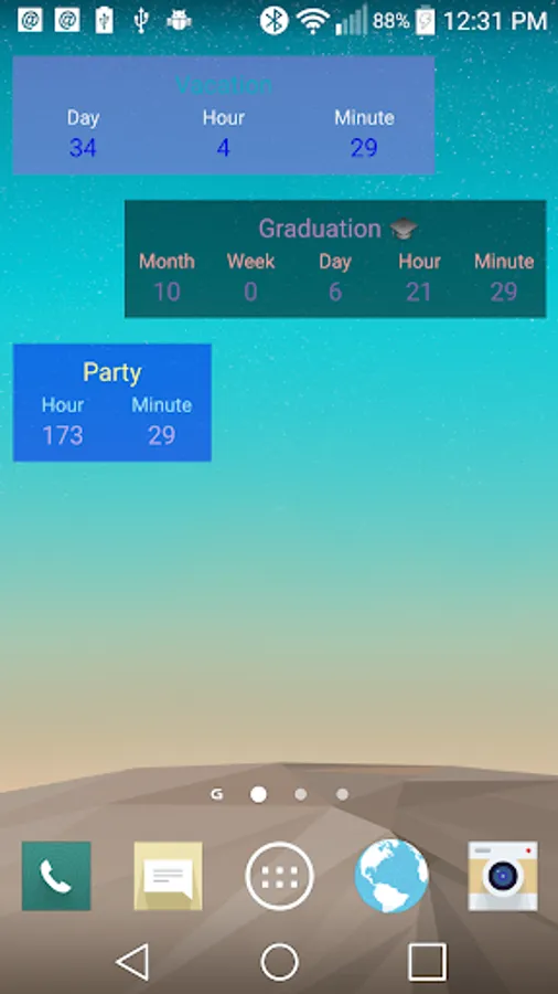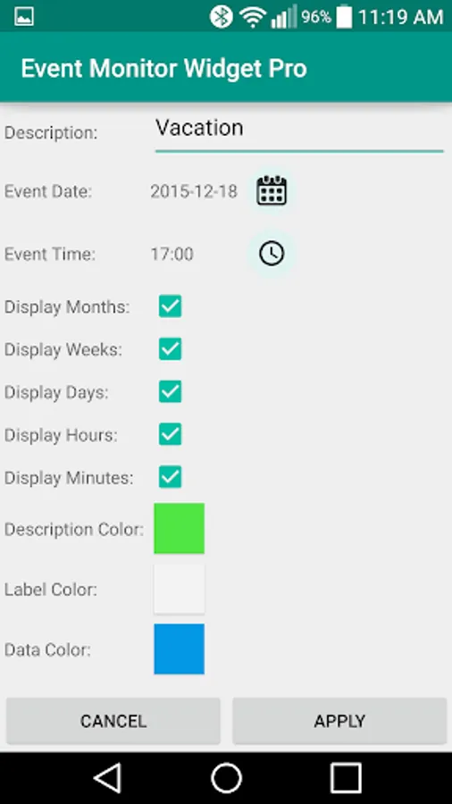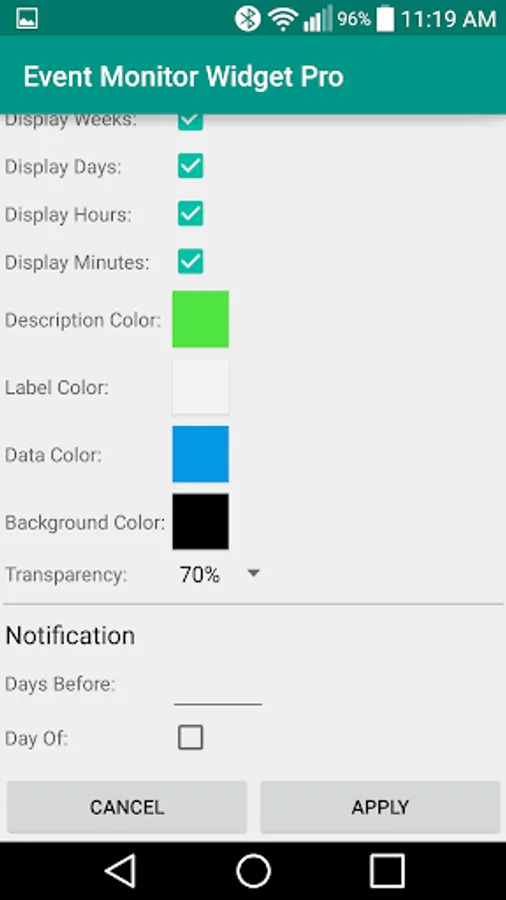 This is one of the most customizable event countdown widget on the market. It allows you to choose how much or how little details you want the countdown widget to display until your planned event. You can also select the look of the widget to best compliment your device by selecting the background color and transparency and customize the color of the widget text.