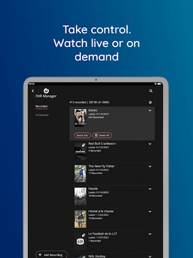 - Manage your recordings, schedule recordings or delete what you’ve finished watching.
