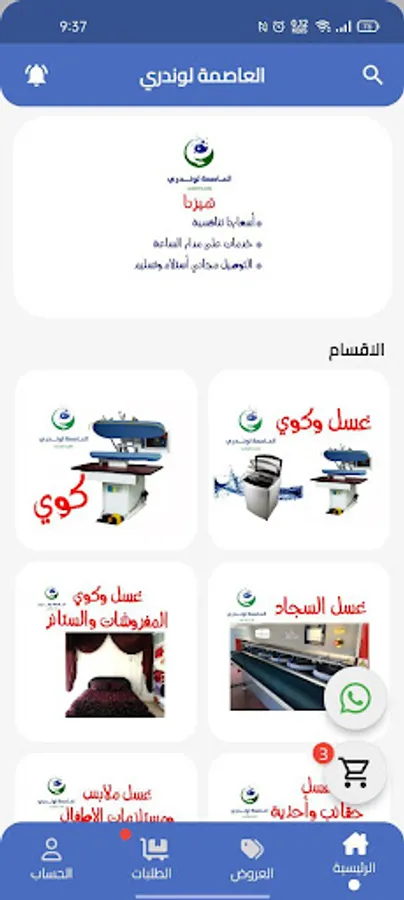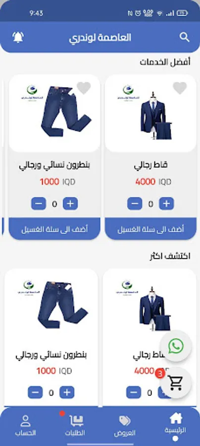 The first application in Iraq in the field of laundry and ironing and other various services with high quality and accuracy and an enjoyable experience of requests through the application .. The application aims to reduce and save the time required to obtain all types of services related to ironing and washing services quite easily with the possibility of giving opinions and notes and contacting us in order to provide better services and permanent development