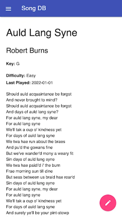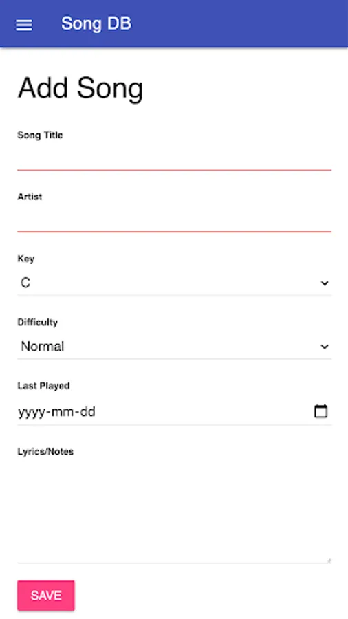 A simple way for performers to keep track of their known songs and help select songs based on key, difficulty, and last-performed date. Keep notes or lyrics for each song for reference!