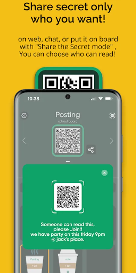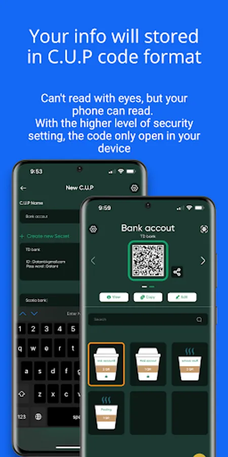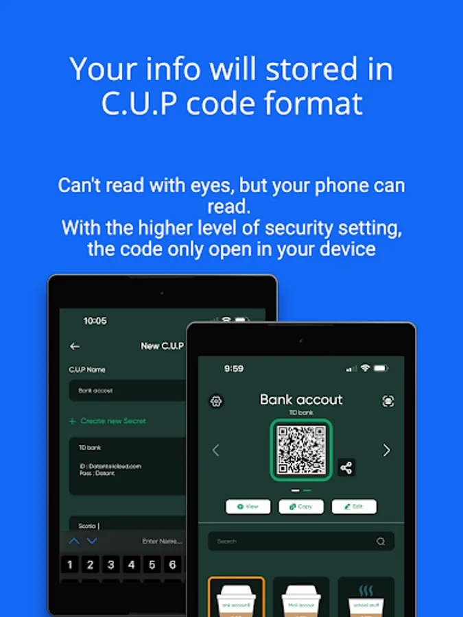 User can use C.U.P general way such as using on app , but the C.U.P code is so secure, even if you print it and put it on the wall, nobody can’t read except you.